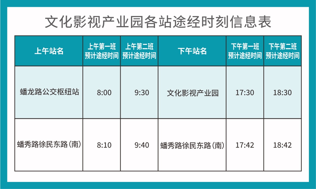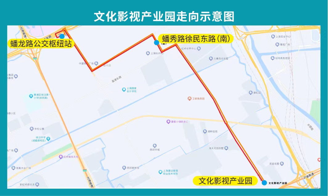 据了解,该线路早班车分8:00、9:30两班,自蟠龙路公交枢纽站(近地铁17号线蟠龙路站2号口)出发,途经蟠和路、崧泽大道、蟠龙路、徐民东路、蟠秀路、盈港东路、诸光路,最终到达文化影视产业园;下午5:30、6:30从文化影视产业园出发,原路返回到达蟠龙路公交枢纽站,转乘地铁17号线。为了方便员工换乘2号线,中途设置了蟠秀路徐民东路(南)上车点。
