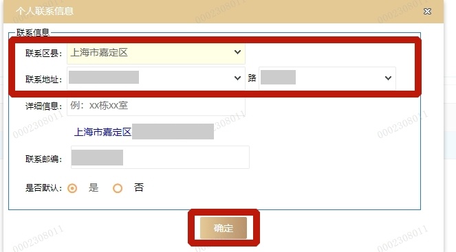 3. 录入时“联系区县”“XX路”“XX号”字段需通过输入关键字后从下拉框中点选的方式录入(如:录入上海市嘉定区,可在框中录入“嘉定”,再从下拉框中点选“上海市嘉定区”),编辑完成后点击“确定”按钮。