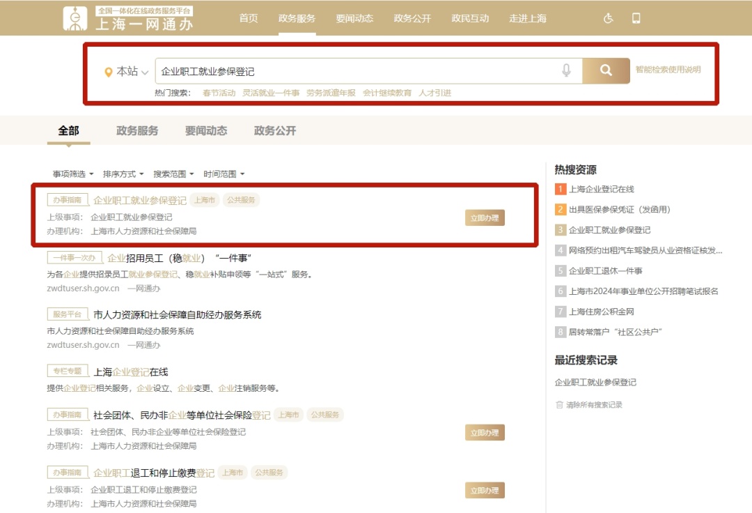 1. 您可登录“一网通办”平台首页,在搜索框录入“企业职工就业参保登记”,点击智能检索按钮,在搜索结果中找到该事项,点击右侧的“立即办理”,系统将自动跳转至办理页面。
