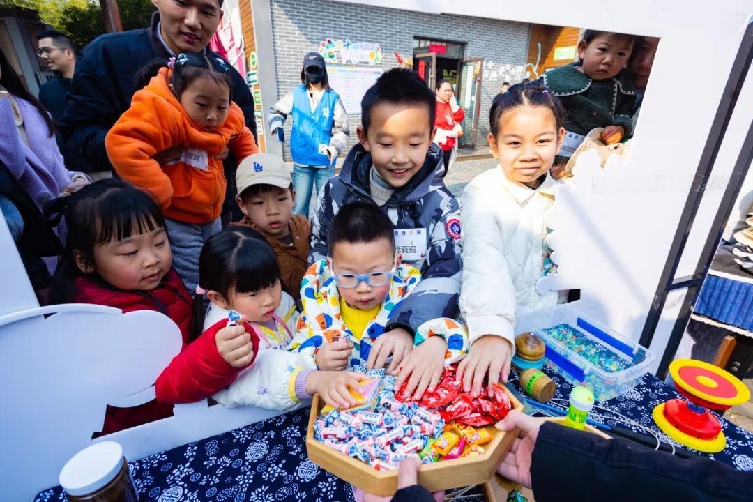 在怀旧角,镰刀、耙子、锄头等农具和生活用具摆放整齐,铁皮青蛙、打弹珠等儿时玩具勾起大家的童年记忆。老上海小零食更是让人们回味无穷,大白兔奶糖的香甜仿佛还萦绕在唇齿之间。孩子们对这些难得一见的老物件充满好奇,忍不住上前摸索体验,家长们则在一旁分享着过去的故事,感叹着时光流转。