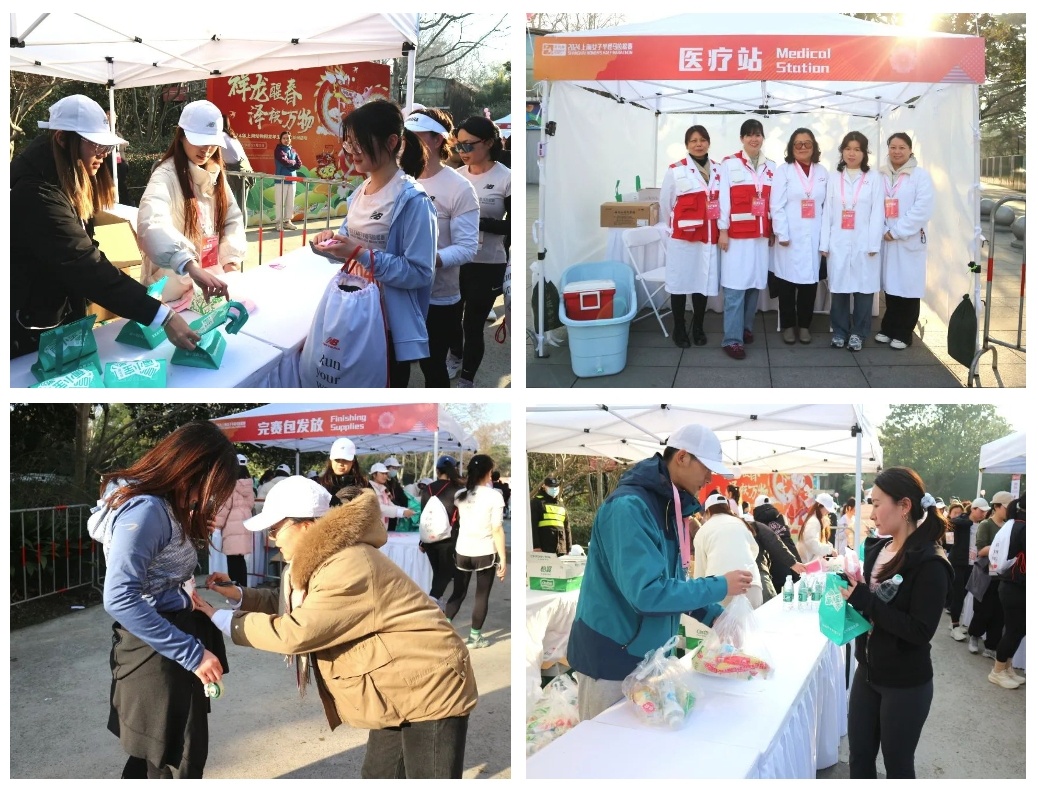 “恭喜您完成比赛!”在健身跑终点的物资领取处,志愿者们为每位完赛选手发放了寓意美好的“花朵”奖牌及食物、饮品等完赛包物资;医疗站点内,服务人员针对跑者可能出现的发烧、低血糖等症状设置了应对措施,同时还配有心肺复苏、救护车转诊等服务。据了解,此次共有20余位志愿者在健身跑赛道沿线及终点提供现场服务。