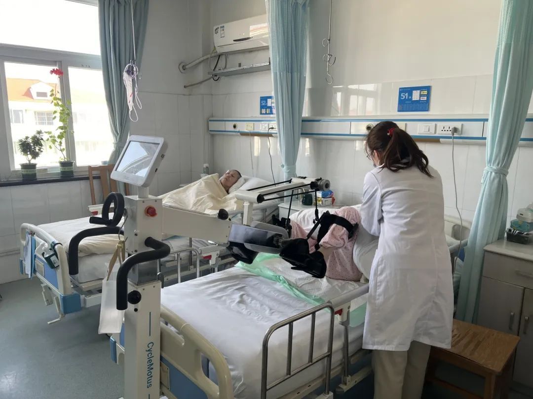 相比之下,护理病房更显寂静和沉重。几乎完全丧失运动能力的老人们躺在一张张白花花的病床上,他们不能自主翻身,需要借助电动机器被动活动四肢。疾病像一根绳子,把患者们死死捆在病床上动弹不得,护理人员的帮助就是照进他们生活中的一道光。