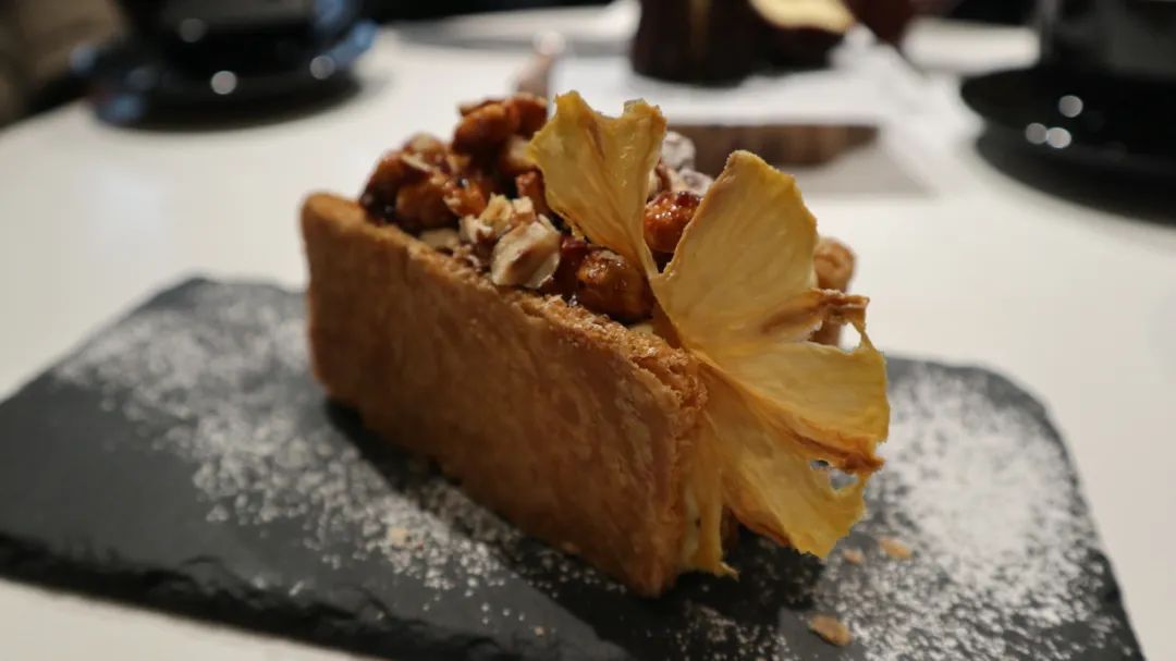 另一款招牌产品——榛子拿破仑蛋糕,造型十分“华丽”。烤得香脆可口的酥皮,夹着奶香浓郁的起司,洒满了裹着焦糖的香脆榛子和各种坚果,再插上一片烤制的菠萝花,咬一口,口感丰富,让人回味无穷。