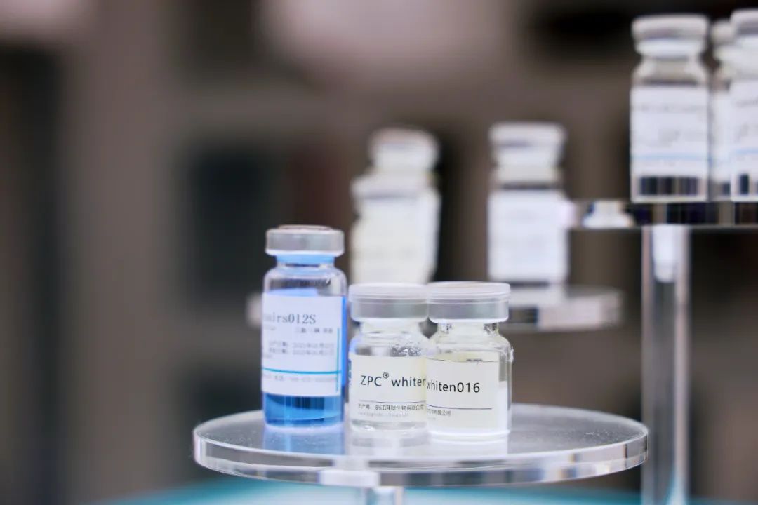 产品展示大厅里,陈列着数十种获得国家发明专利并成功实现技术成果转化的原料产品。以蓝铜肽为例,产品呈蓝色液体状,是化妆品的主要成分,可起到抗衰祛皱、抗氧化提亮、抗炎修护的功效。