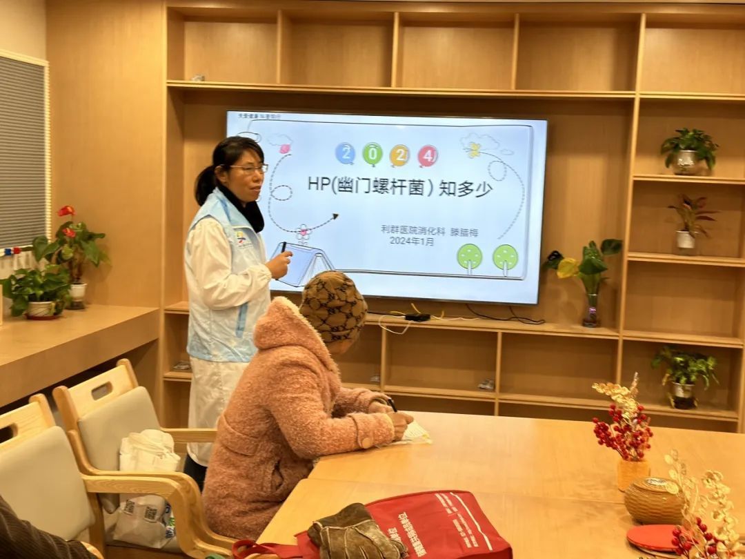为普及健康知识,提高人民群众对幽门螺杆菌感染危害性的认识,利群医院消化内科滕腊梅医生为社区居民开展了主题为《HP(幽门螺杆菌)知多少》科普宣教。