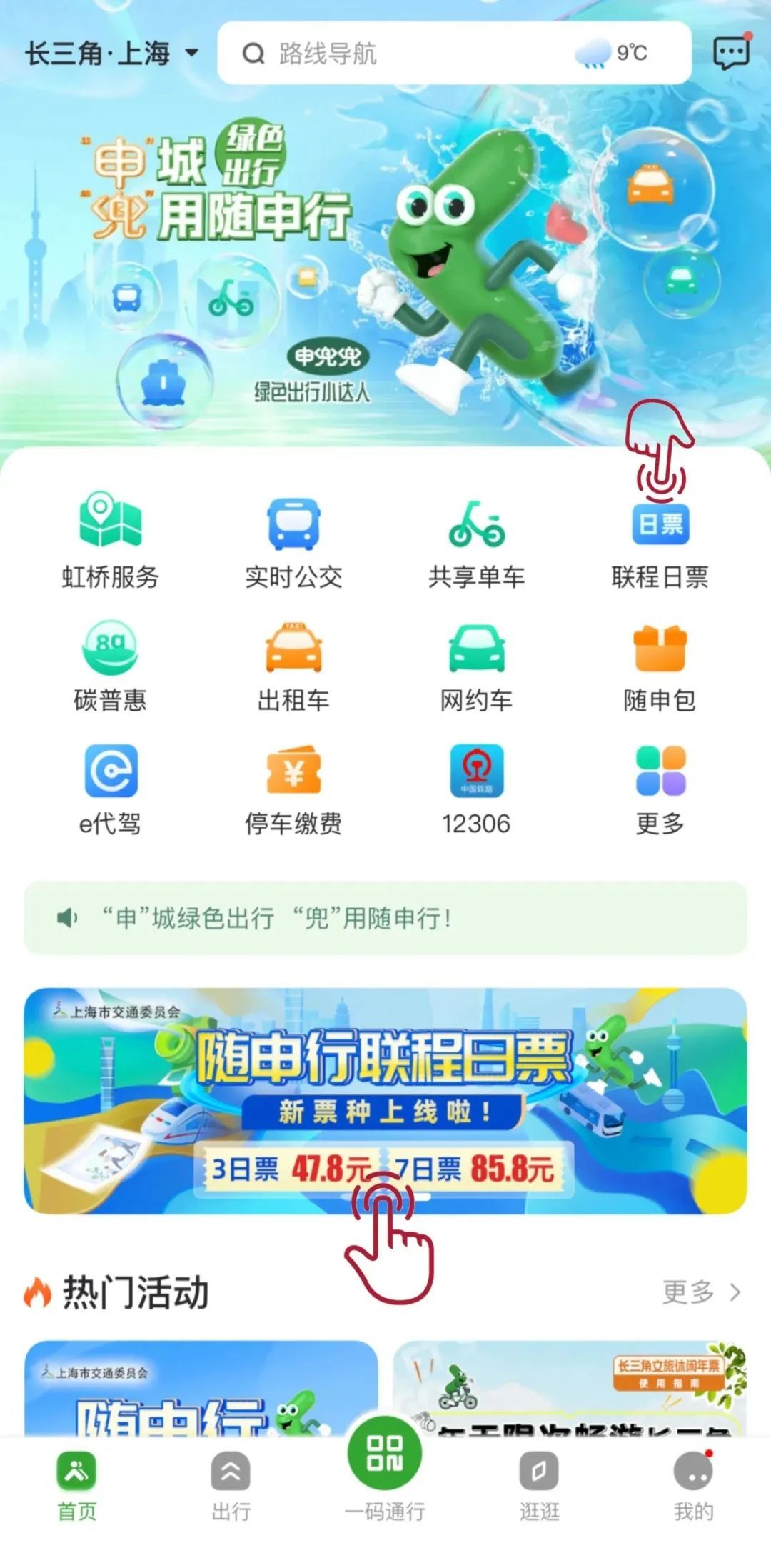 “随申行”APP 集公交、轨道交通、轮渡等公共交通出行方式和一键叫车、智慧停车等出行服务,为市民提供全方位、换乘优惠、多模式出行的交通方式,引导低碳出行。