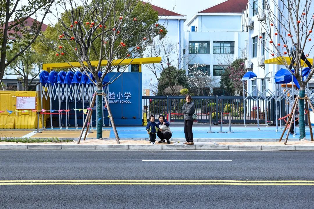 先前,机动车道与非机动车道之间仅有标线隔离,遇到路侧临时停放车辆的路段,非机动车就要借道机动车道,存在安全隐患。为保障慢行交通的安全,此次改造特别设置了非机动车隔离带,且在学校入口两侧新增护学通道,色彩鲜艳的地面辅以清晰的地面导行标识,为学生的安全通行保驾护航。