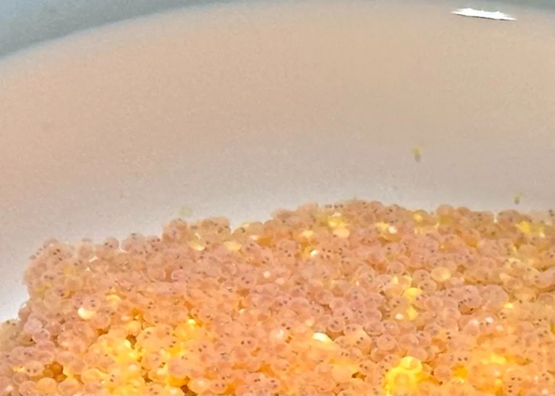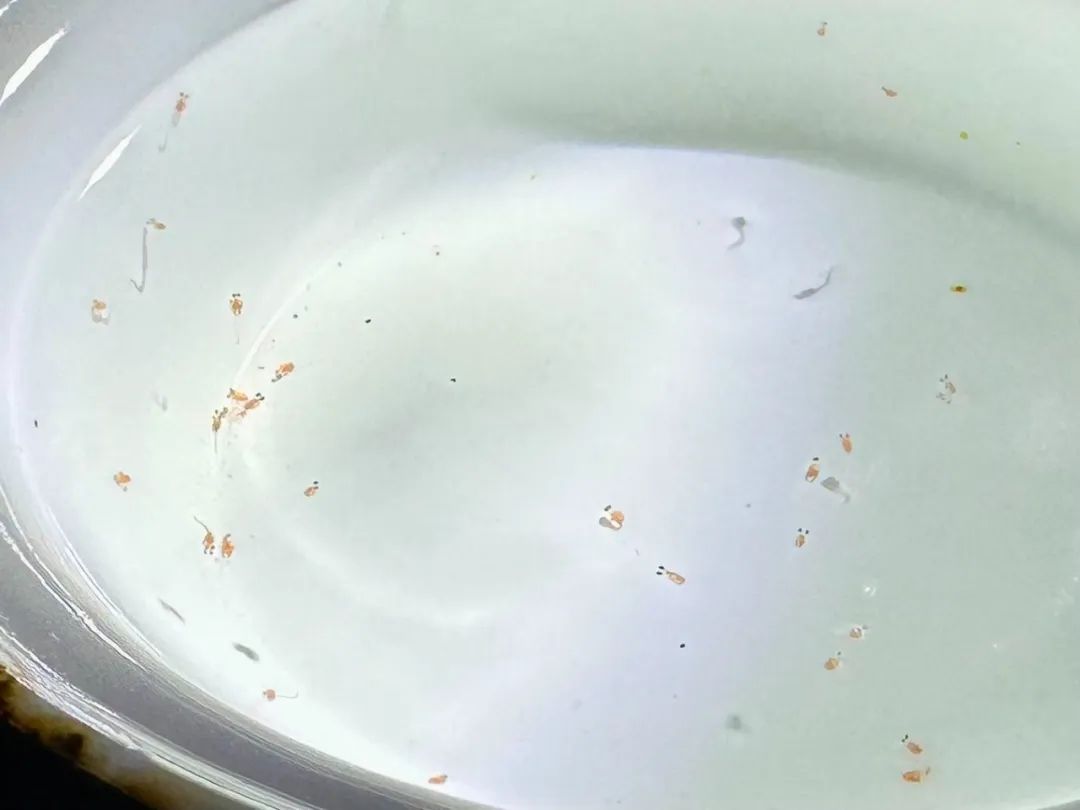 记者试着舀起一瓢水,在手电筒的照射下,看到很多鱼卵已经萌生出成对的黑点,这便是四鳃鲈的眼睛。而发育更快的则已经脱膜,长出了小尾巴,正在水中灵活游动。记者看到,此时的鱼苗个头比米粒还要小,通体呈粉色透明状,灯影下仿佛一只只小蝌蚪。
