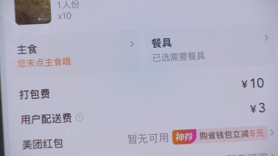 体察员在调查过程中发现,不少外卖店铺的打包费下单时是“按件收取”的。例如,下单1份素鸡,收取1份打包费1元,下单2份素鸡,收取2份打包费2元,以此类推,如果下单10份素鸡,就要收取10元打包费。