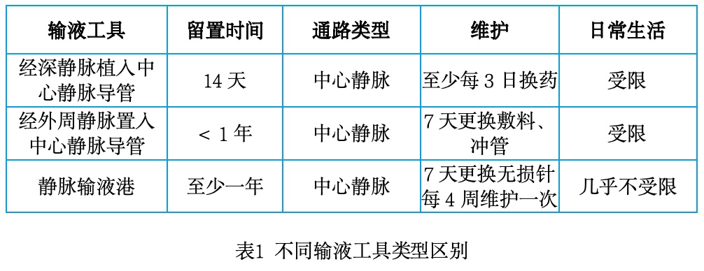 相较于其他静脉输液置管工具(见表1),静脉输液港完全植于皮下,需行局部小手术植入和取出。适用于需长期或重复静脉输注抗肿瘤药物的乳腺癌患者,还可用于输注胃肠外营养液、输血和静脉采血;相对于其他静脉输液工具比较,具有更低的感染、血栓、堵塞等发生率;相对于其他静脉输液工具具有更长的维护间期,非治疗期每四周维护冲洗1次,可长期留置,不影响患者大部分的日常活动(如洗澡、游泳、跑步、简单家务等),生活质量明显提高。