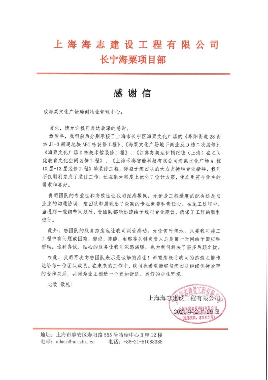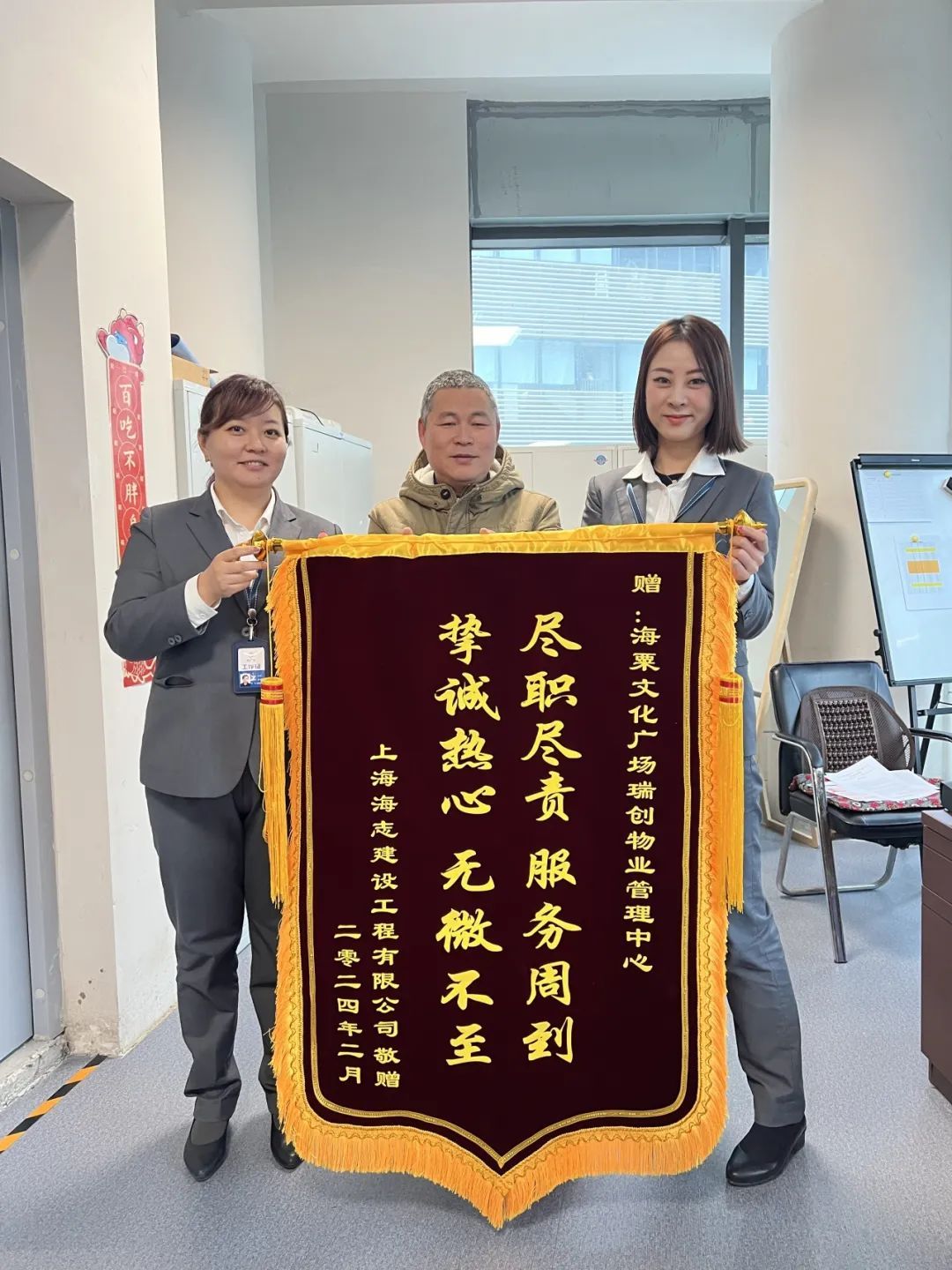 近日,瑞创物业在管项目海粟文化广场物业服务中心收到了来自上海海志建设工程有限公司送来的一面锦旗和一封表扬信,感谢物业在装修期间提供的帮助和贴心服务。