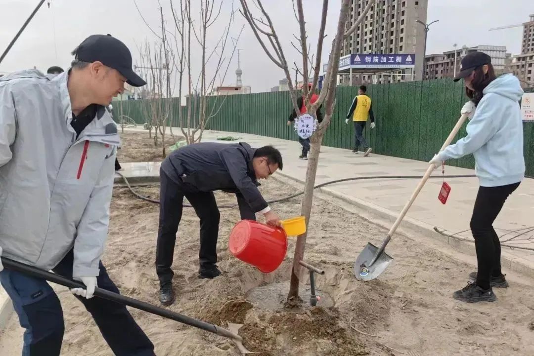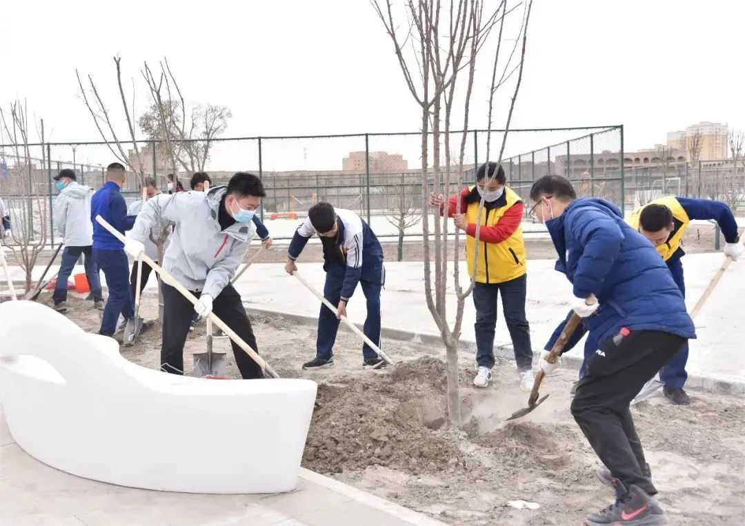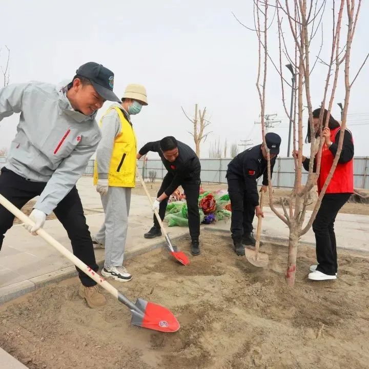 活动中,援疆干部人才、公安干警、消防员、各族学生、群众志愿者一起,选树、搬树、扶正、培土、踩实、浇水,各小组有序分工、紧密协作,植树活动热火朝天。