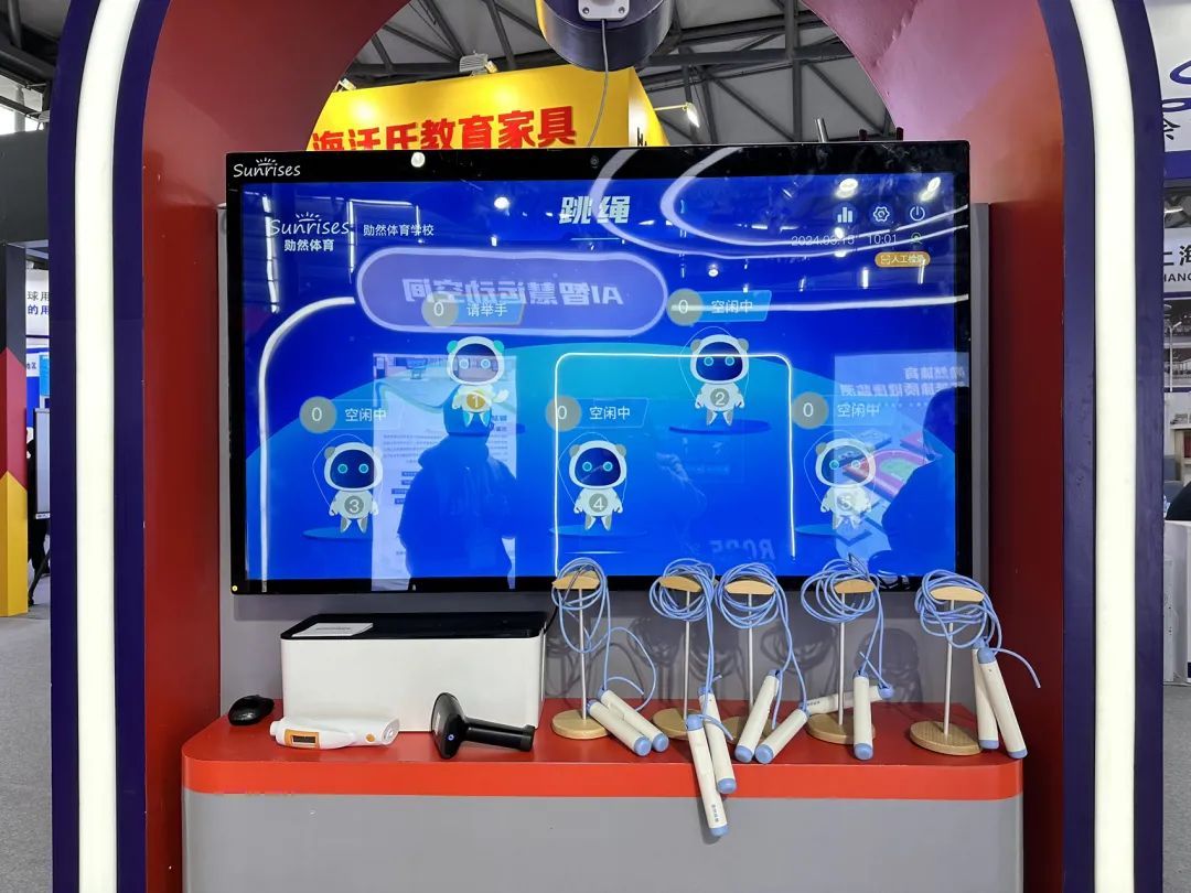 和小伙伴们站到屏幕前,朝着屏幕挥挥手,一场体育竞赛就开始了!比一比,谁跳绳跳得更多?谁立定跳远跳得最远?一块AI体育测试屏吸引了不少参观者的注意。