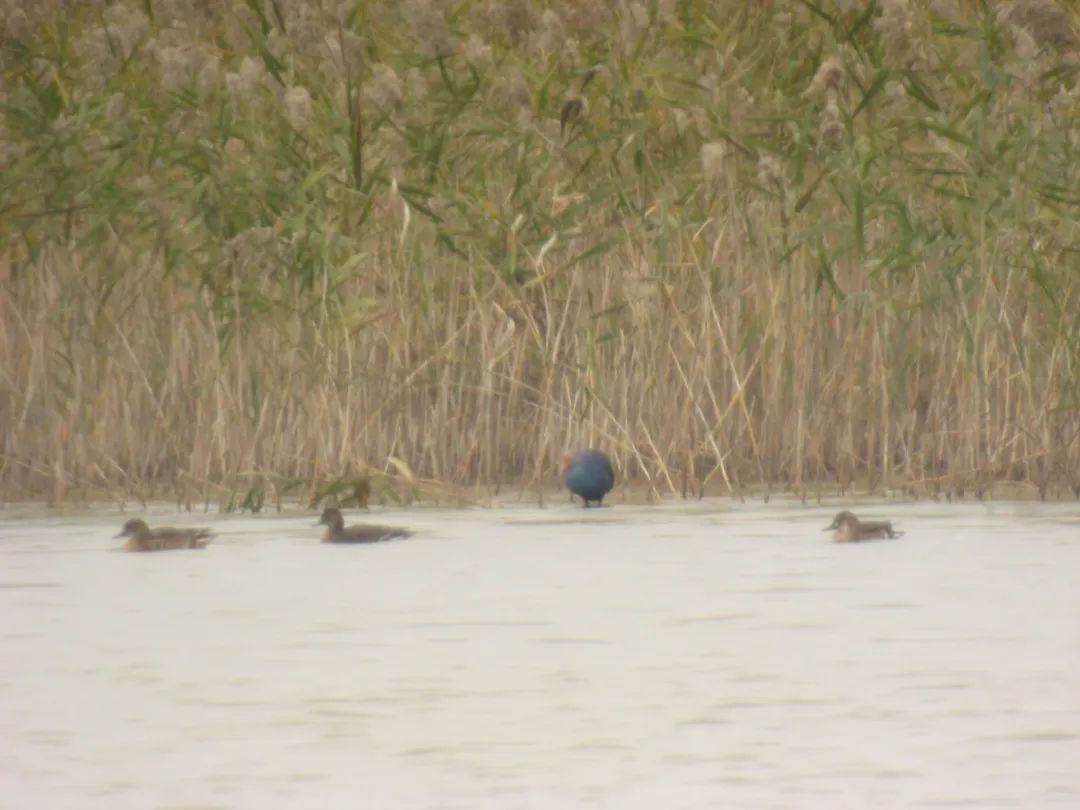 当天上午,工作人员在保护区生态修复区A区监测时,通过单筒望远镜,在靠近湖中心的芦苇丛边缘,意外发现一只身披蓝紫色羽毛的鸟。后经仔细鉴别后,判定是一只紫水鸡,随后又在不远处发现另一只紫水鸡,时而游动,时而站立在漂浮植物上。