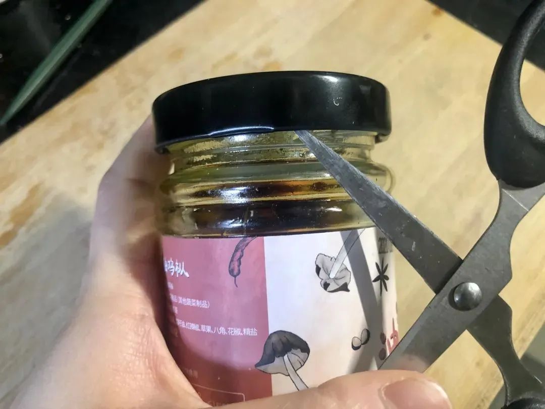 每个罐头盖子的边缘,都有一小块儿凹下去的地方。用不锈钢勺子、剪刀、水果刀,从凹陷处的边缘伸进盖子和瓶身的缝隙里,稍微用一点力就可以撬开。