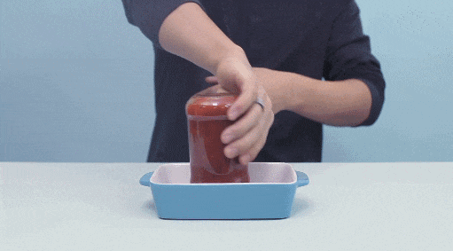 步骤一:把罐头倒置在装满温水的盆中,等待十几秒。