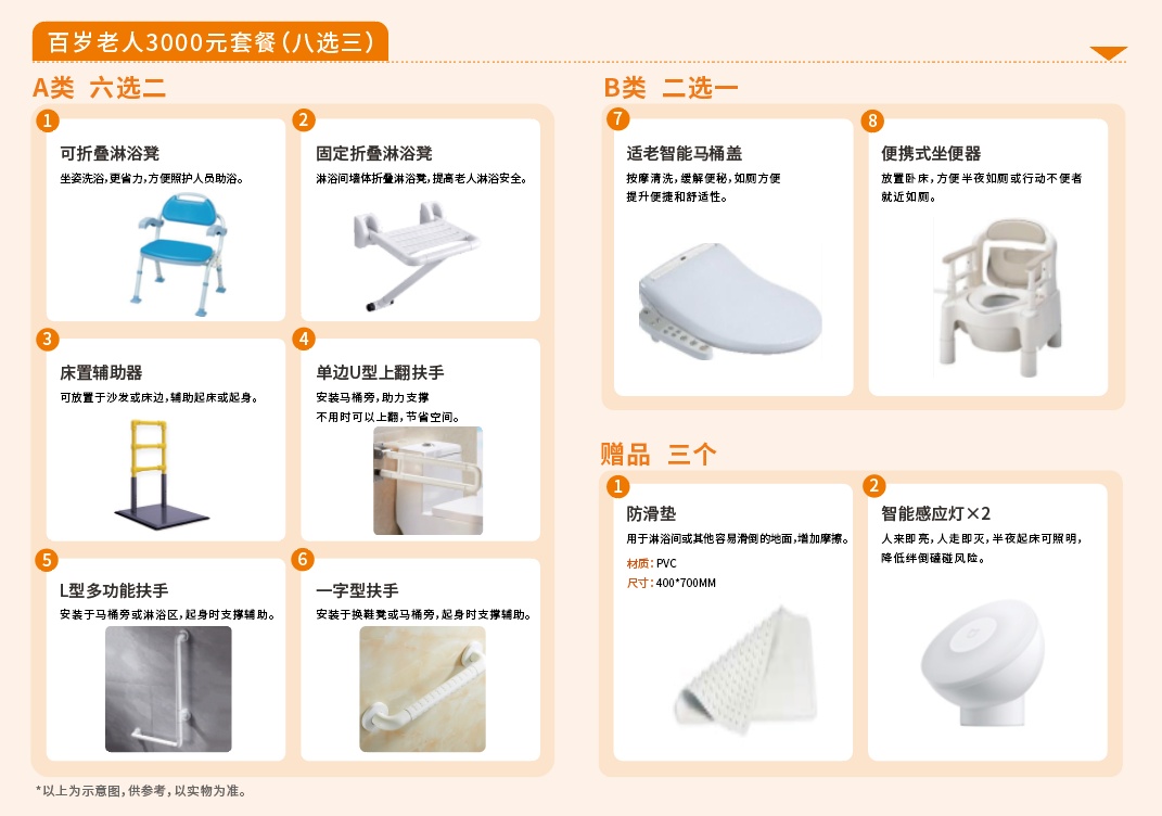 百岁老人适老化产品包套餐价值3000元,含A、B两类共8种设施可供选择(八选三)。