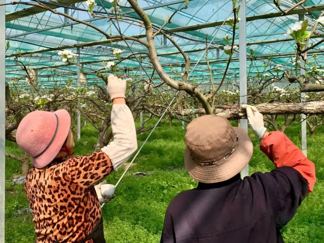 一树树梨花绽放枝头,五六名梨农正手持授粉工具,蘸取花粉轻点在花蕊上。授粉后,雪白的梨花花瓣仿佛涂上了胭脂,白里透粉,煞是好看。