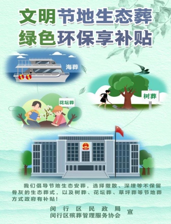 二、倡导移风易俗、推广生态安葬。崇尚绿色、生态、环保理念。大力推行树葬、花坛葬、壁葬、草坪葬、骨灰深埋、海葬等节地生态葬式,促进人与自然和谐发展,更好造福子孙后代,发扬勤俭节约美德,摒弃攀比浪费陋习,做到“追思先人,简朴为本”。