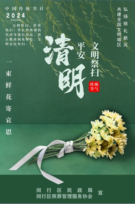 一、倡导文明新风,摒弃陈规陋习。希望广大市民转变传统祭扫的旧观念,树立厚养薄葬的新观念。不搞迷信活动,不吹打扰民,自觉摒弃焚烧锡箔、冥币、纸钱、纸扎品等陈规陋习。倡导居家怀念、网络祭扫、鲜花祭扫、系黄丝带、留心愿卡、代客祭扫、集体公祭等绿色文明的追思方式。