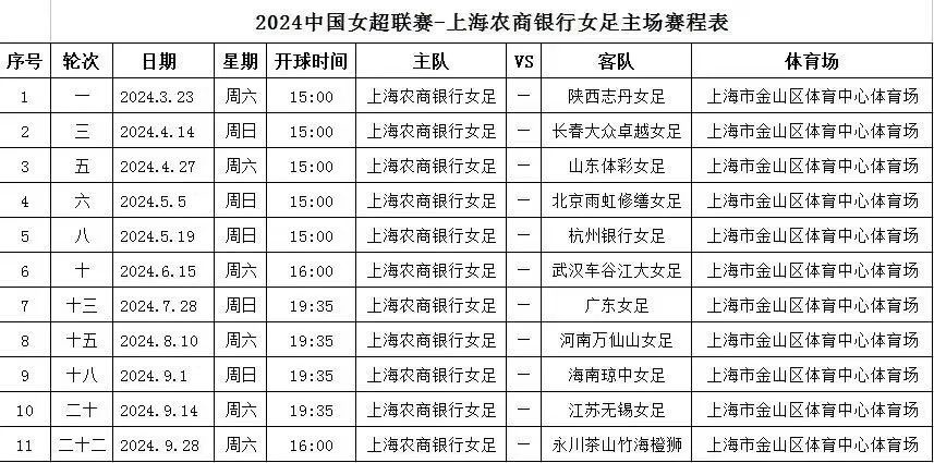 据悉,2024中国太平中国足球协会女子超级联赛将于3月23日至9月28日在全国各赛区举行。今年,上海队主场共11场比赛,首场比赛为2024年3月23日15:00,由上海农商银行女足主场对阵陕西志丹女足。