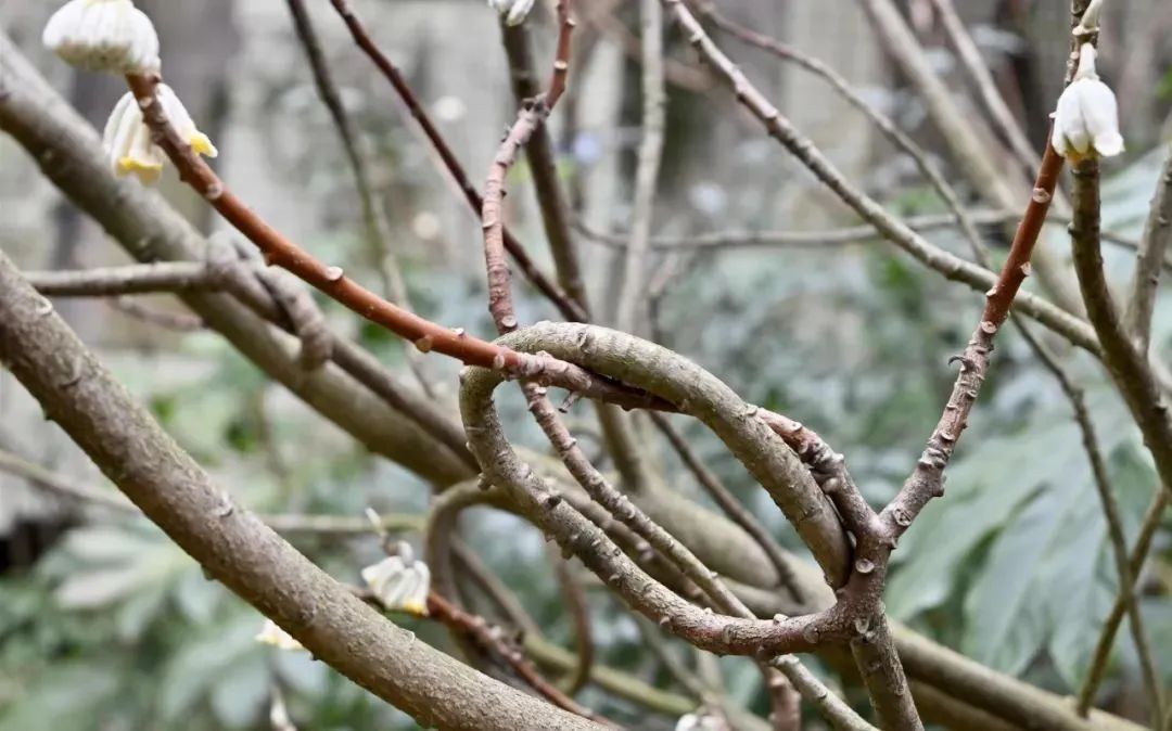 结香是一种小灌木,在长江流域以南较为常见,北方也有种植。结香的小枝很粗壮,常做三叉分枝,这样的分枝方式较为有效地利用了空间,减少了枝叶之间的光竞争,相对分散的排布也更利于昆虫传粉。结香的小枝虽然粗壮,但是也非常柔软,因此,可以“打结”,这也是结香名称的由来之一。