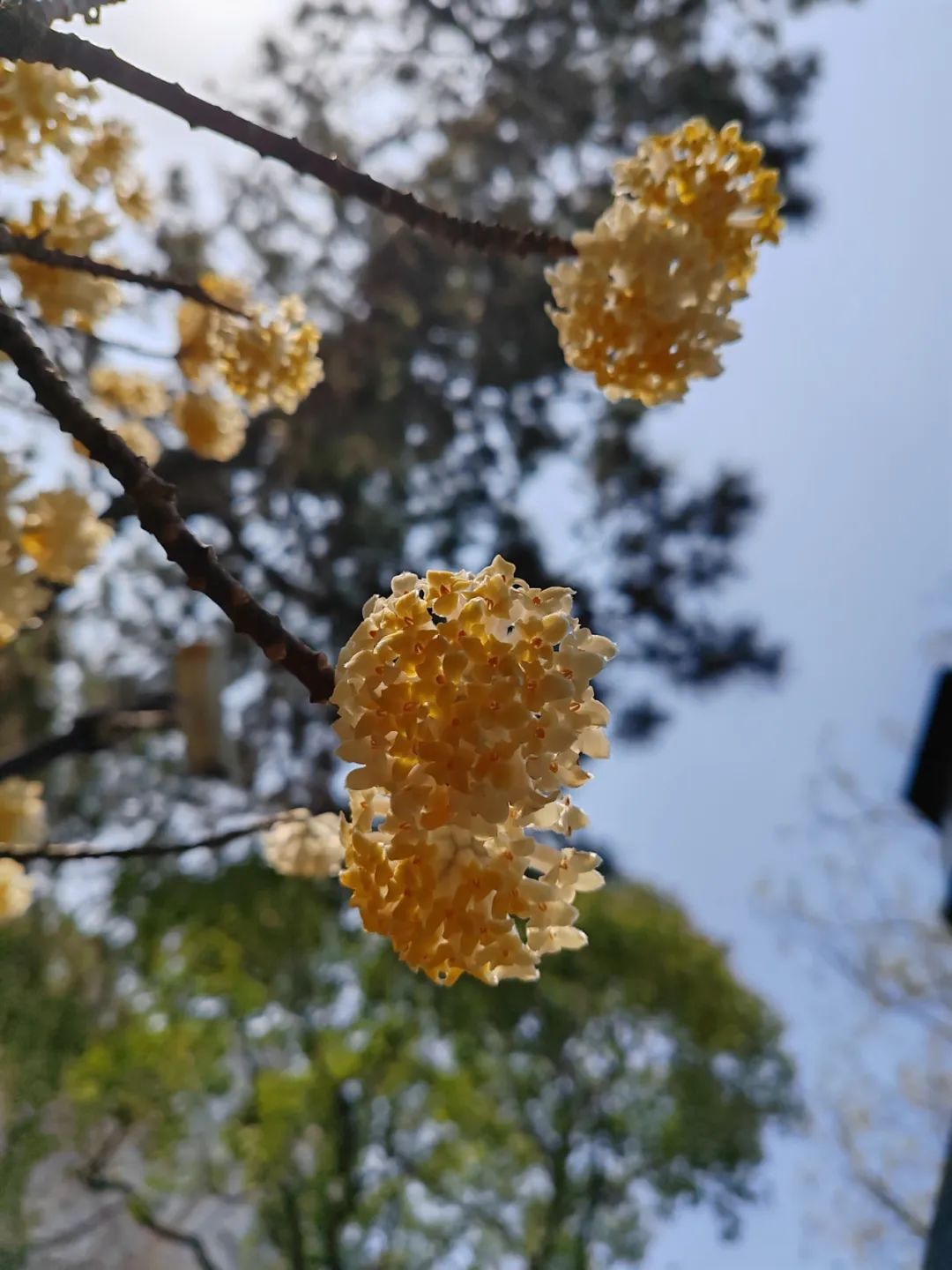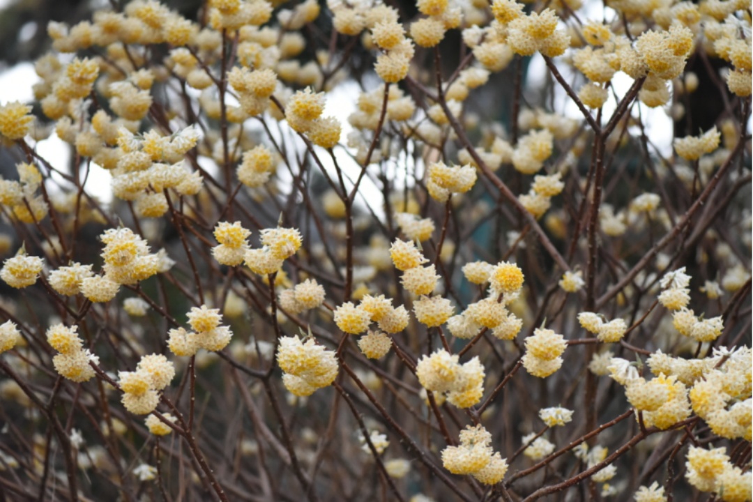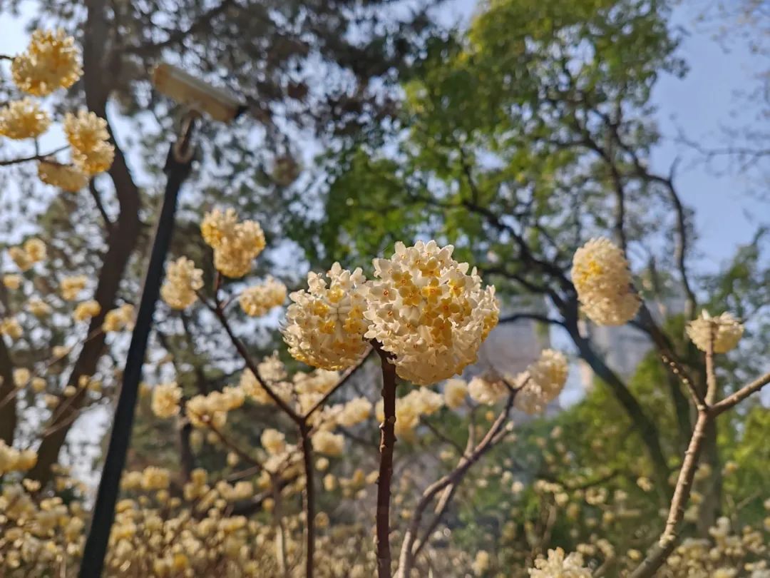 相比早春热度极高的樱花与玉兰,黄色的结香在一片深红浅白中拥有自己的“色彩赛道”。一株株开着明晃晃、金灿灿的小花的“光杆”植株,十分吸睛;同时,结香虽小,却爱“抱团”,众多小花聚在一起,形成了一个个硕大的花球,更为引人注目。