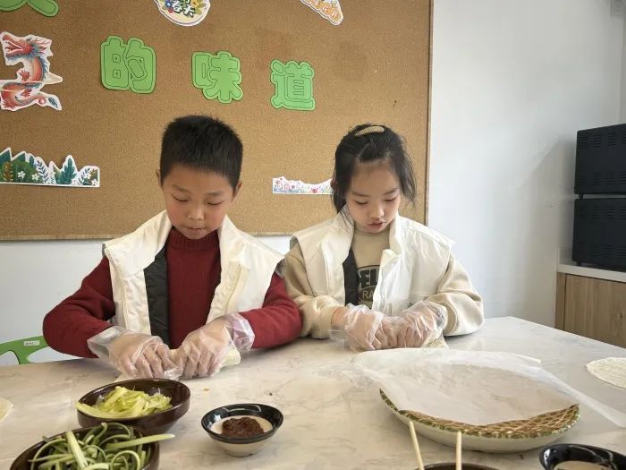 咬春课上,小朋友们跟着老师先后把黄瓜、鸡蛋、韭菜等食材包进春饼里,卷好再蘸调料品尝。
