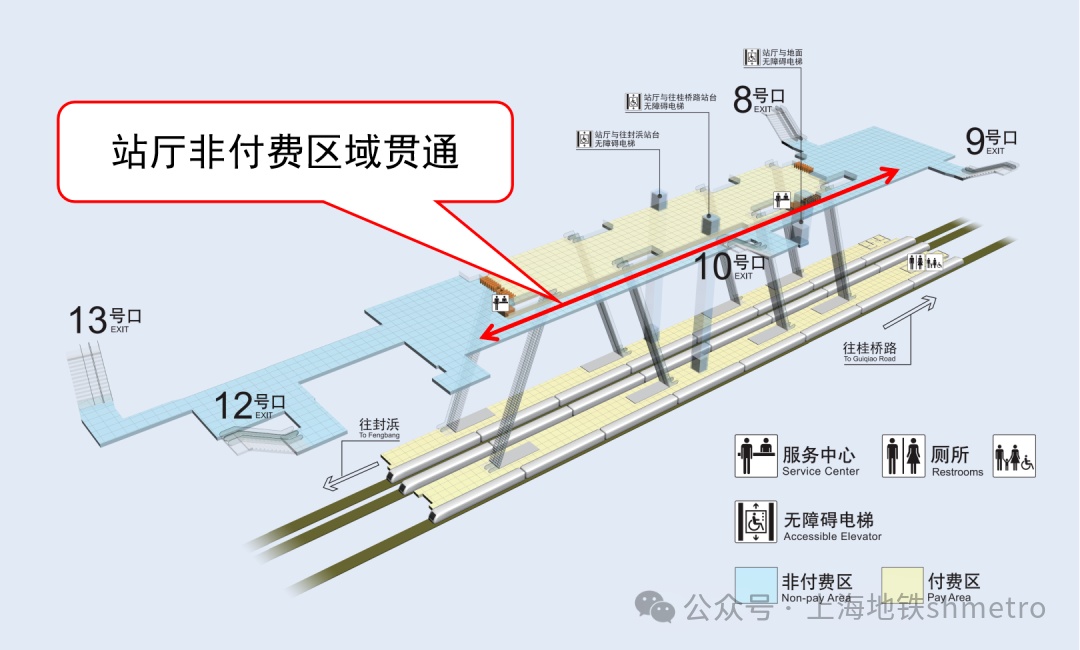 为保障非付费区贯通后车站的正常运营,14号线曹杨路站从导向标识、服务中心、盲道等方面进行合理规划调整,优化站厅层公共区布置,为乘客提供更便捷、优质的指引服务。