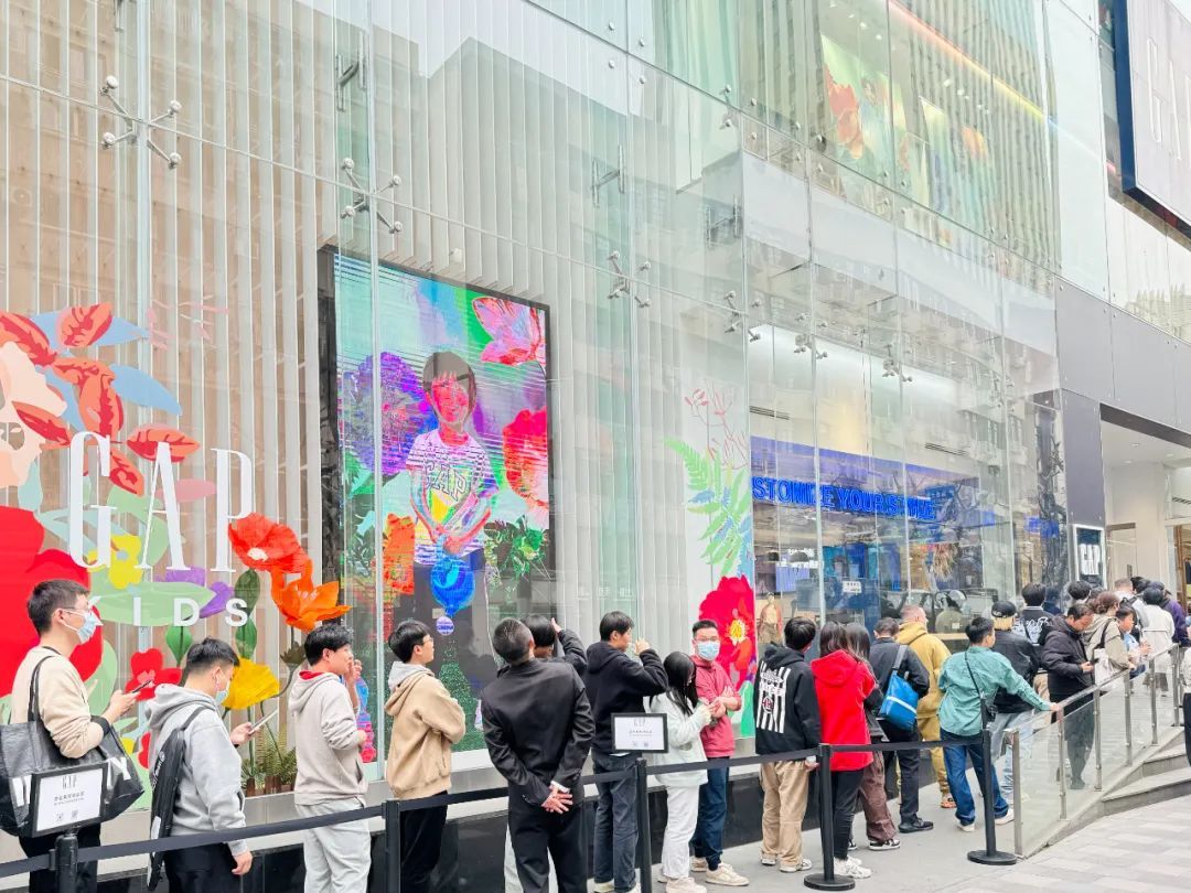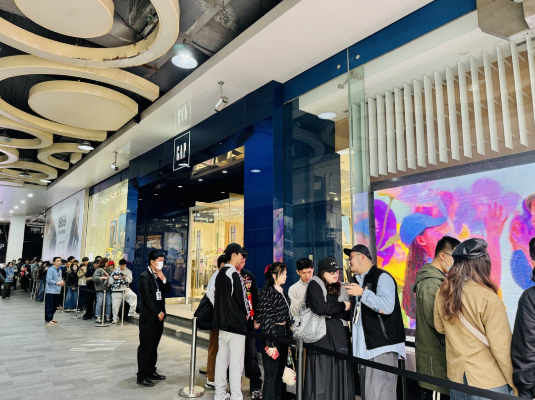 3月23日上午11点,该联名系列在Gap上海南京西路863店、广州正佳广场店、杭州湖滨银泰店和北京蓝色港湾店同步上市。消费者可以登录“Gap盖璞”小程序预约购买资格,限量发售。记者了解到,截至发售前,Gap上海南京西路863店预约已超过3000人,门店外排起了长龙,从门口一直排到了地铁口,不少消费者更是一大早就来排队购买。