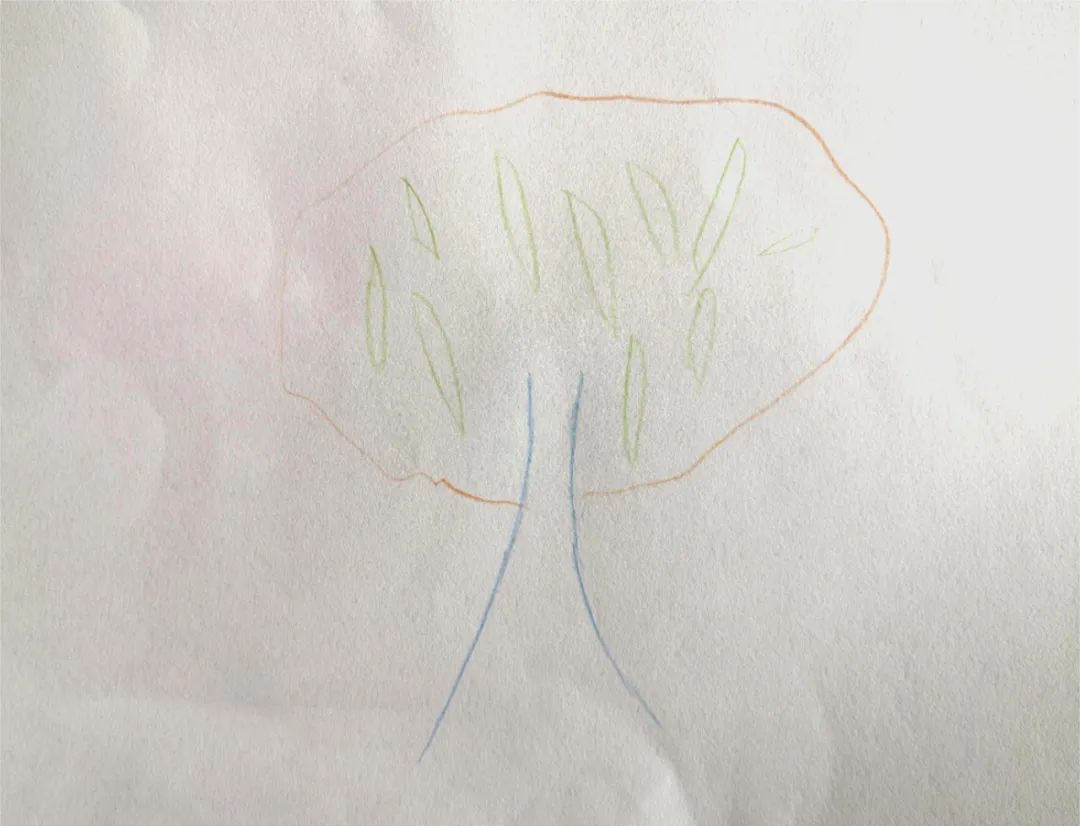 男孩画的树构图相对比较饱满。从画上看,男孩的学习能力毋庸置疑,实际上男孩之前确实学习都是名列前茅的。但冷色的树干,透露出男孩抑了许多负面的体验情绪。