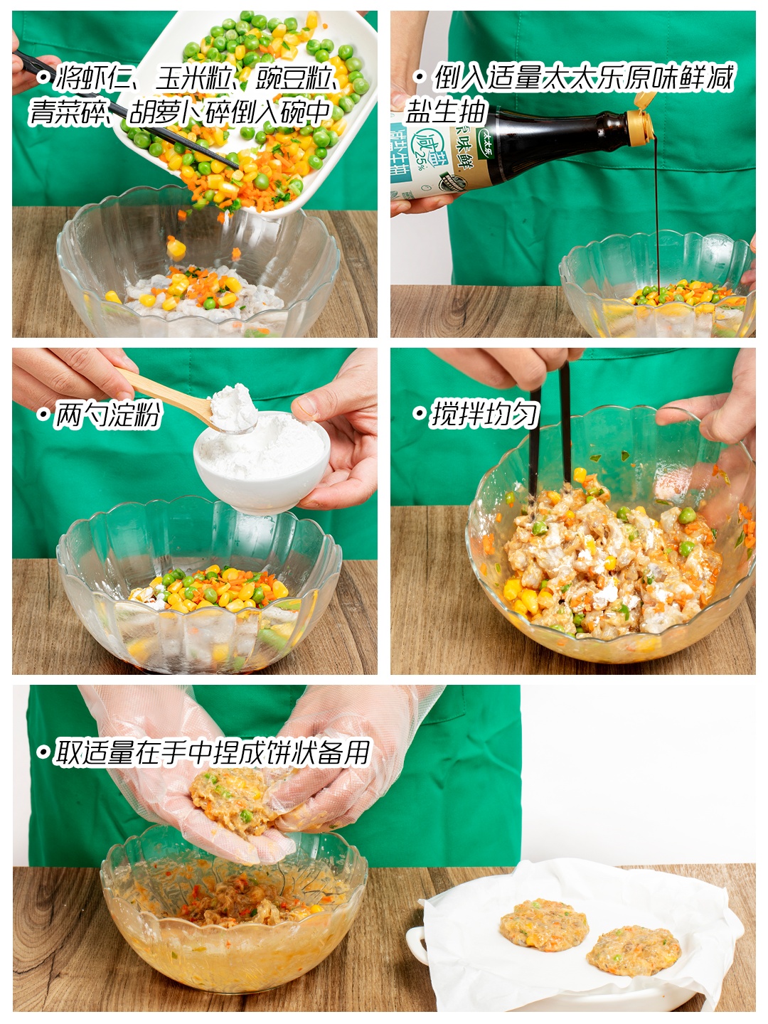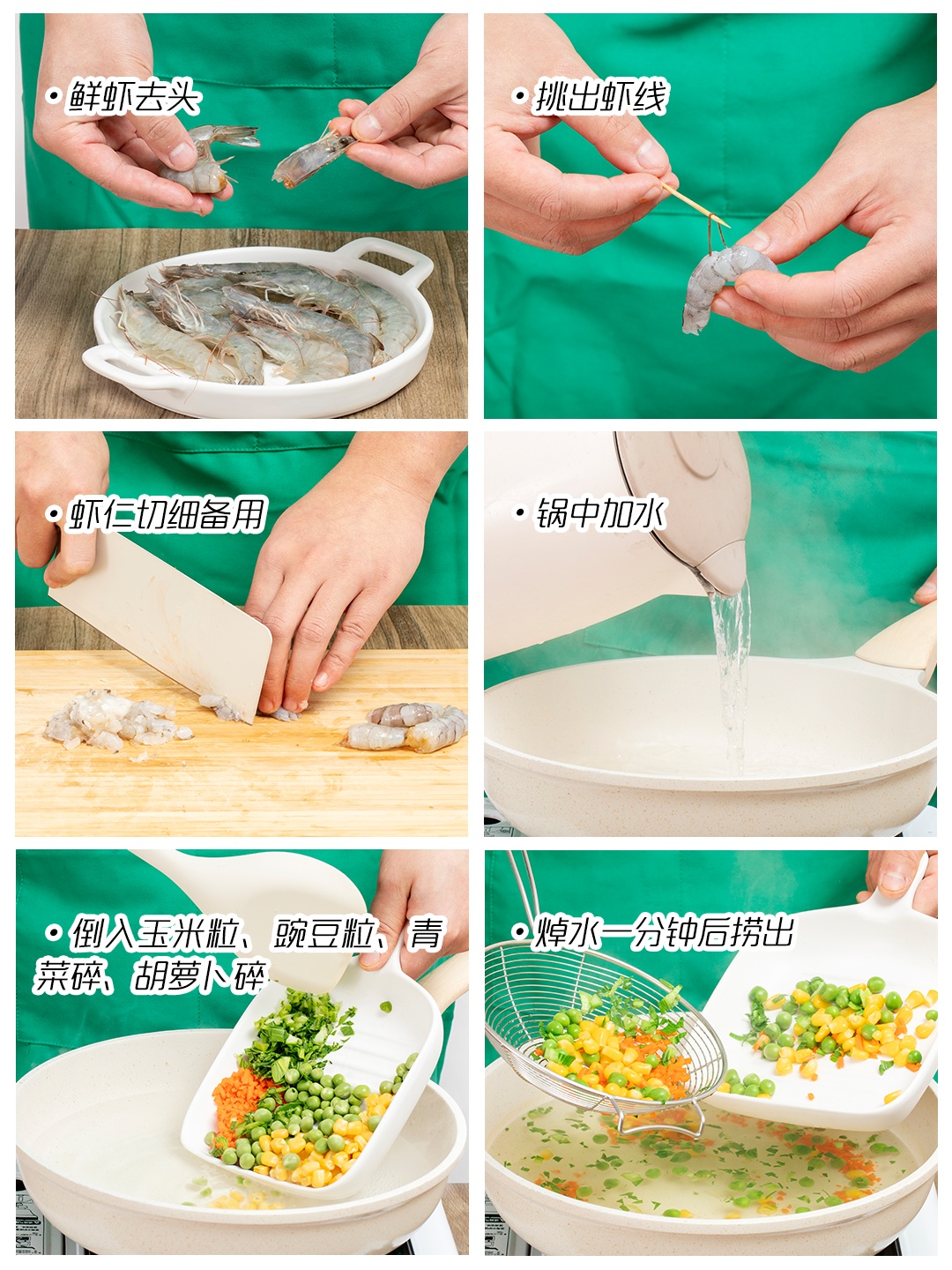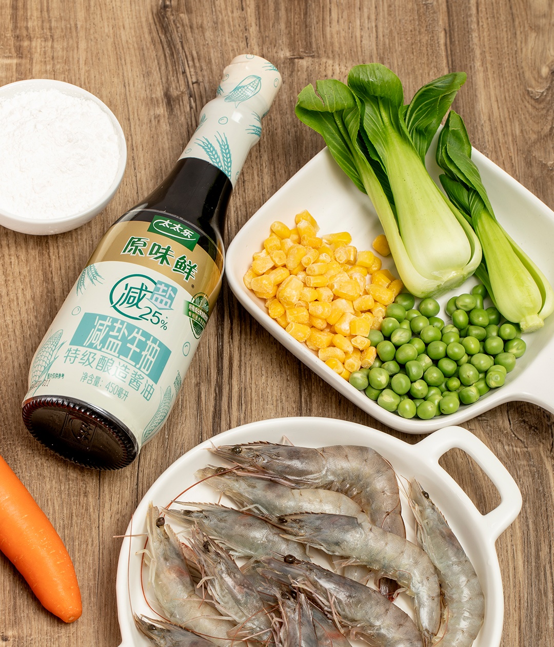 虾仁约80克、淀粉约25克、玉米粒约15克、青菜约20克、豌豆约30克、胡萝卜约35克、生抽约15克。