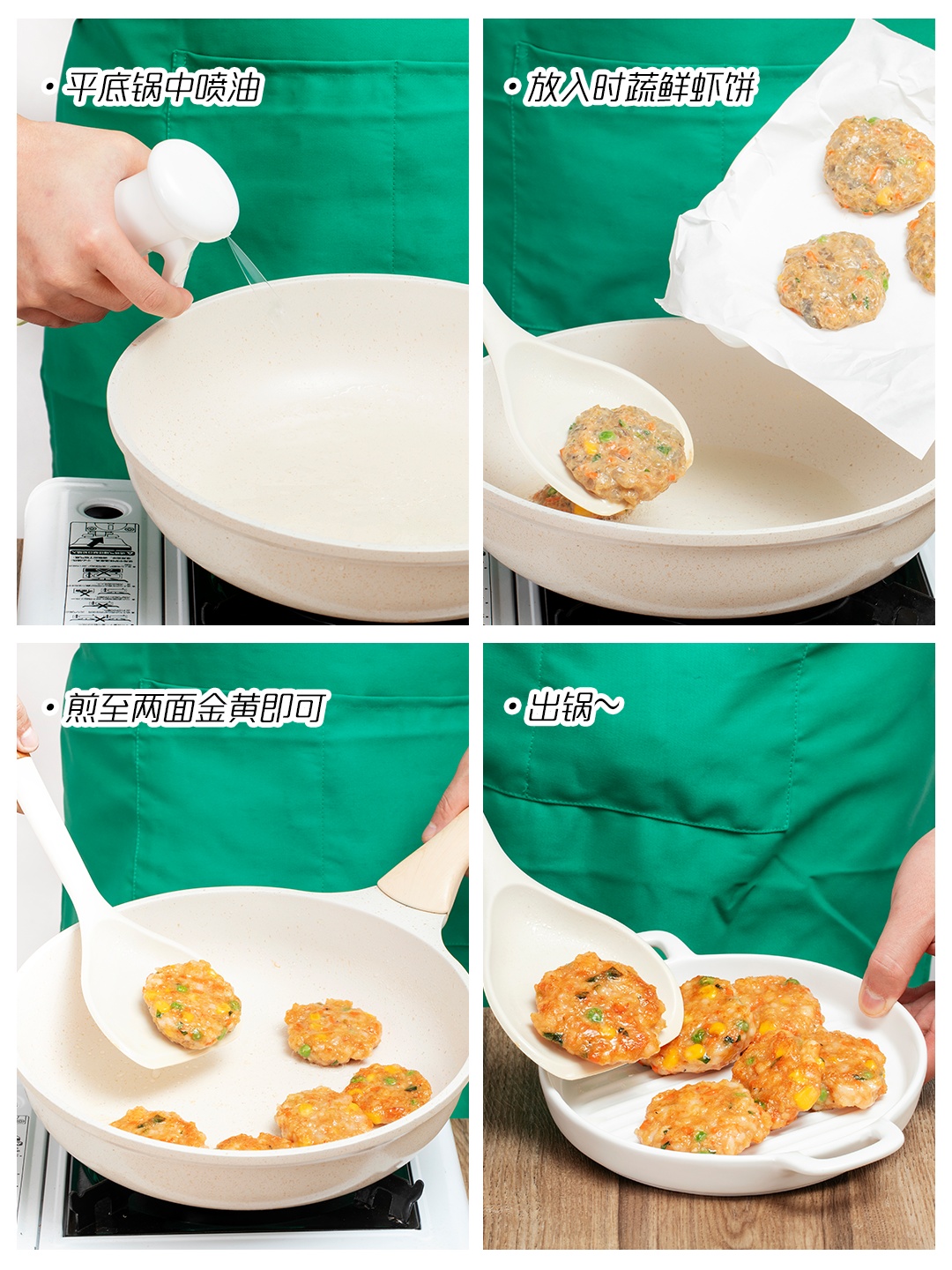 4.热锅倒油,将时蔬鲜虾饼放入锅中,煎至两面金黄熟透即可出锅。