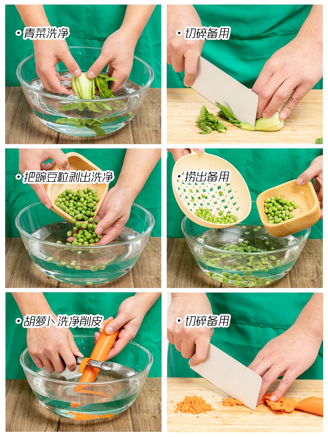 1.将青菜、胡萝卜、豌豆洗净,胡萝卜、青菜切碎备用。