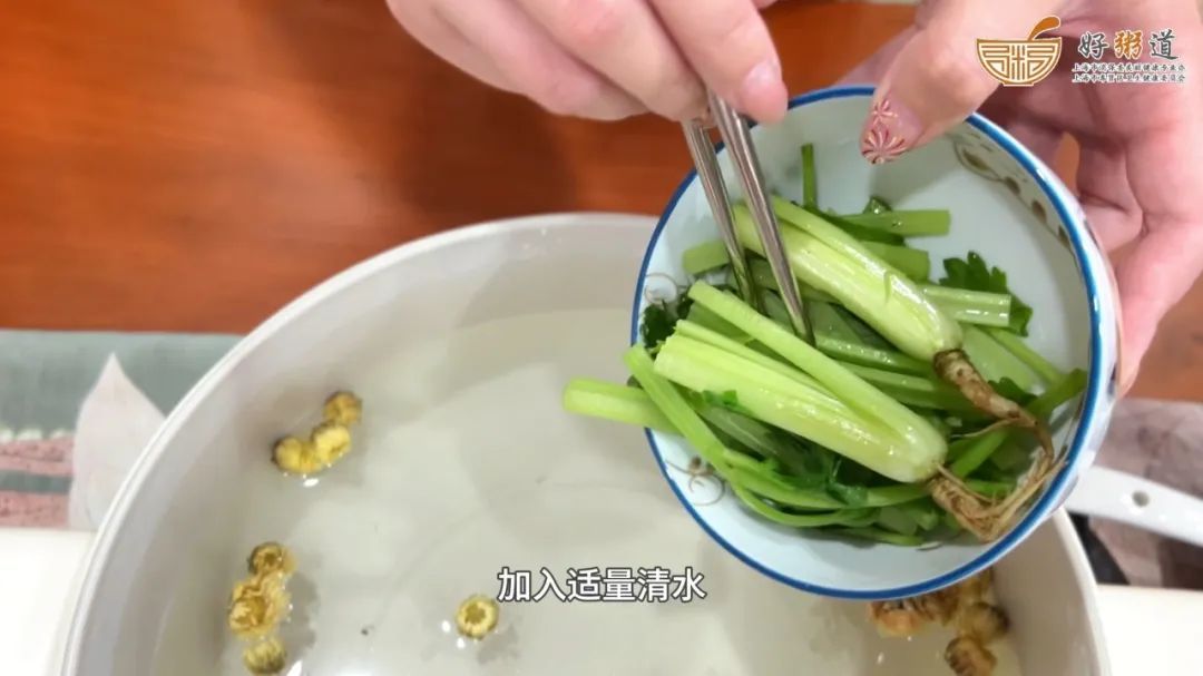 锅中放入菊花和连根芹菜,加入清水适量,大火烧开后小火20分钟,煎出汤汁后将其撇去。