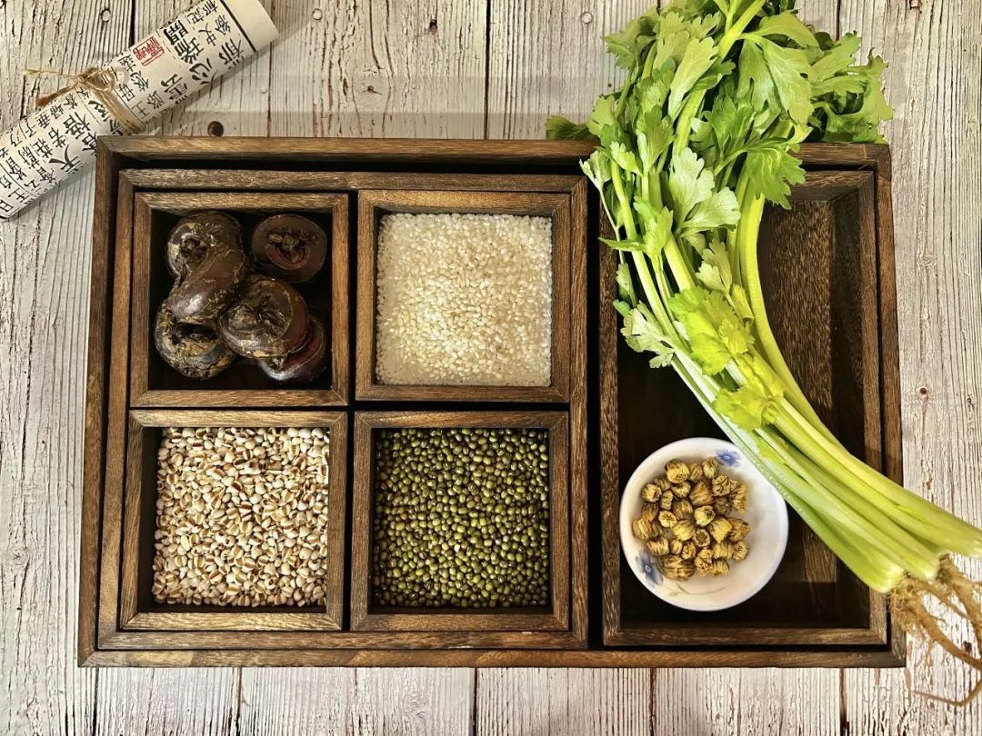 白菊花10克,连根芹菜30克,绿豆30克,薏米50克,粳米100克、去皮马蹄20克。