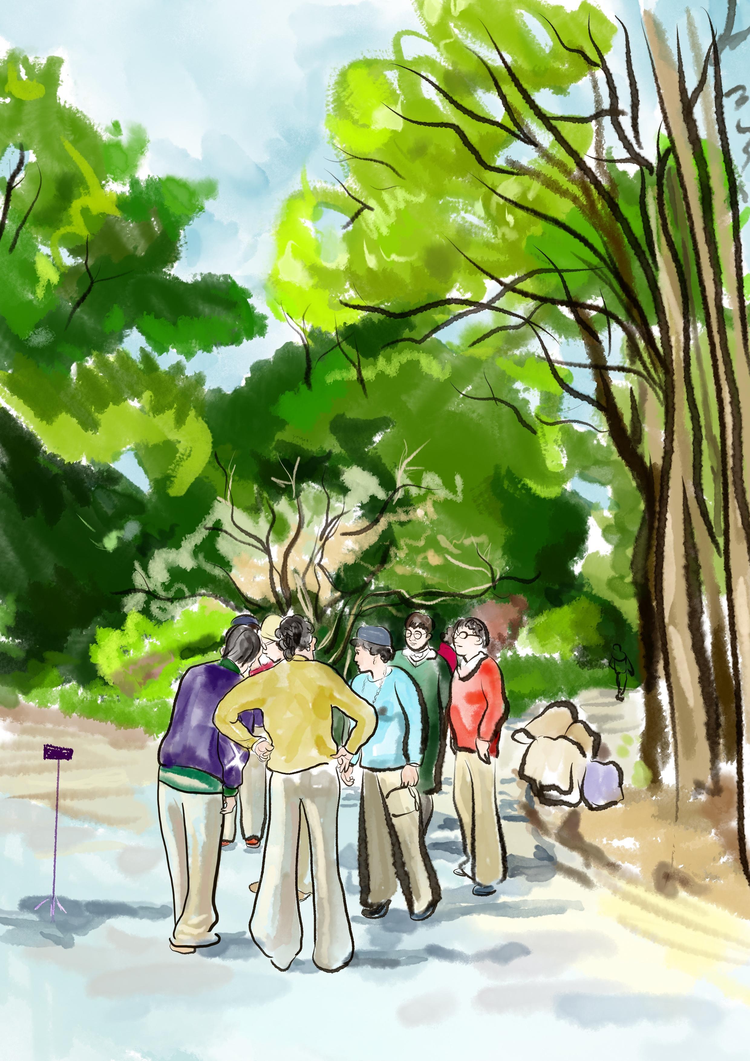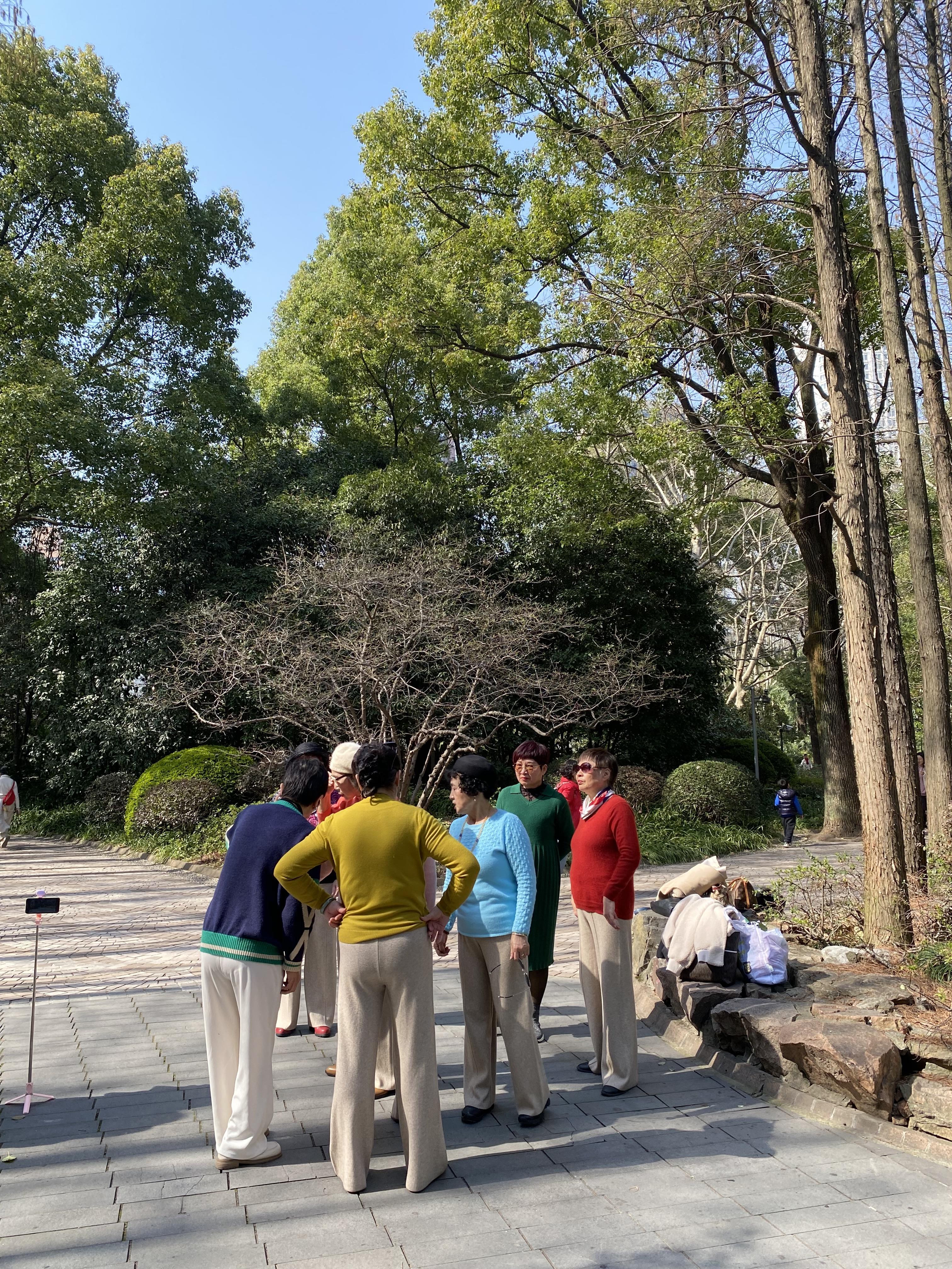 退休的阿姨们穿得花花绿绿,在树林下开始玩起了自拍直播,积极向上的精神状态令人敬佩。