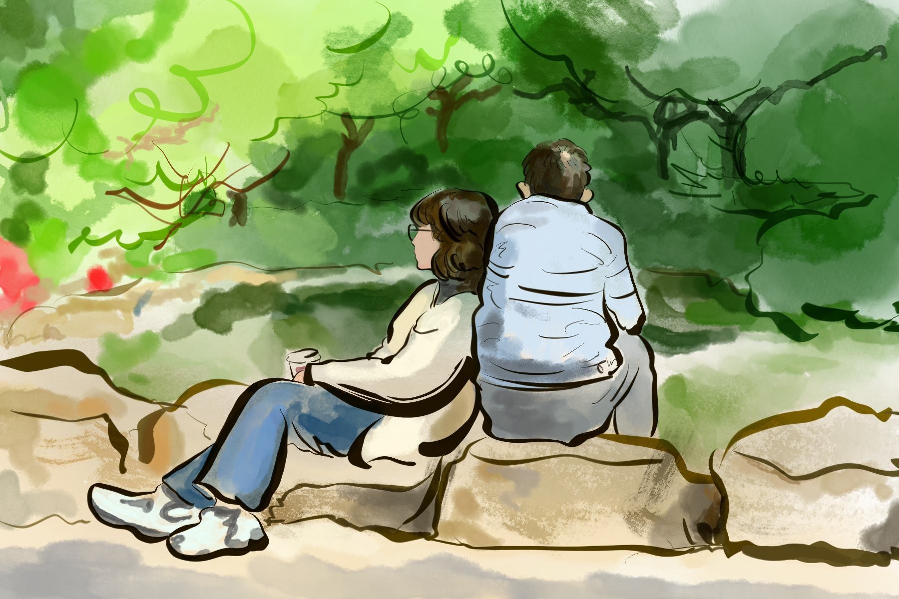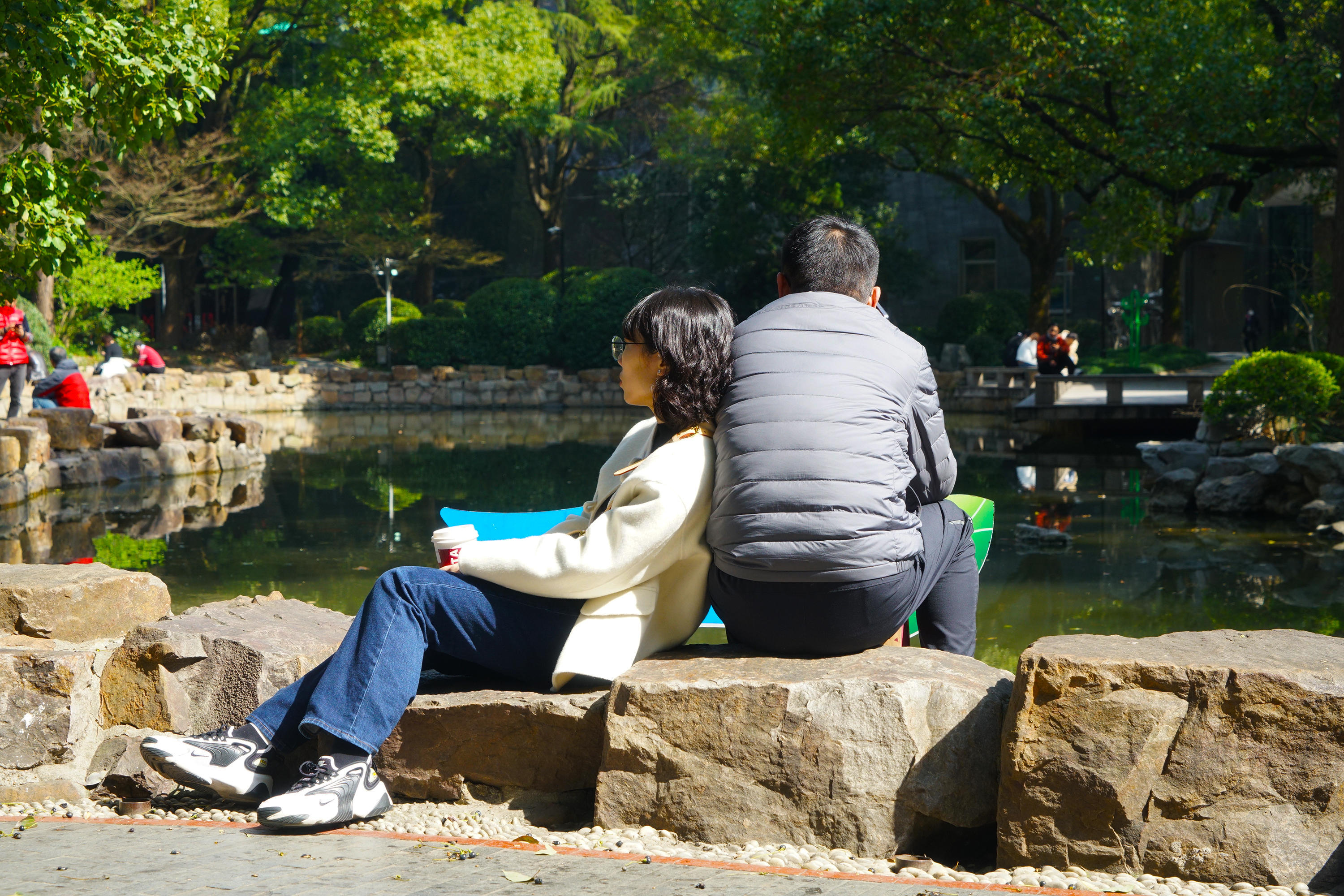 出来午休的情侣,紧挨着坐在湖畔享受片刻的宁静。姑娘握着咖啡眺望远方,一扫工作的紧张与忙碌。