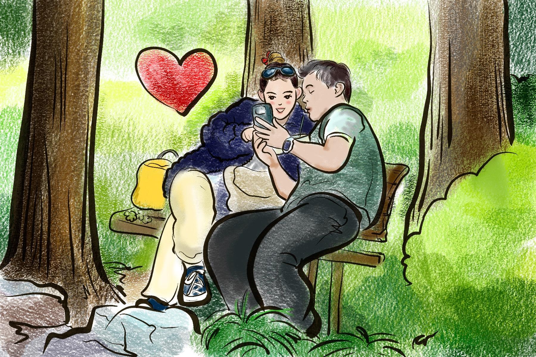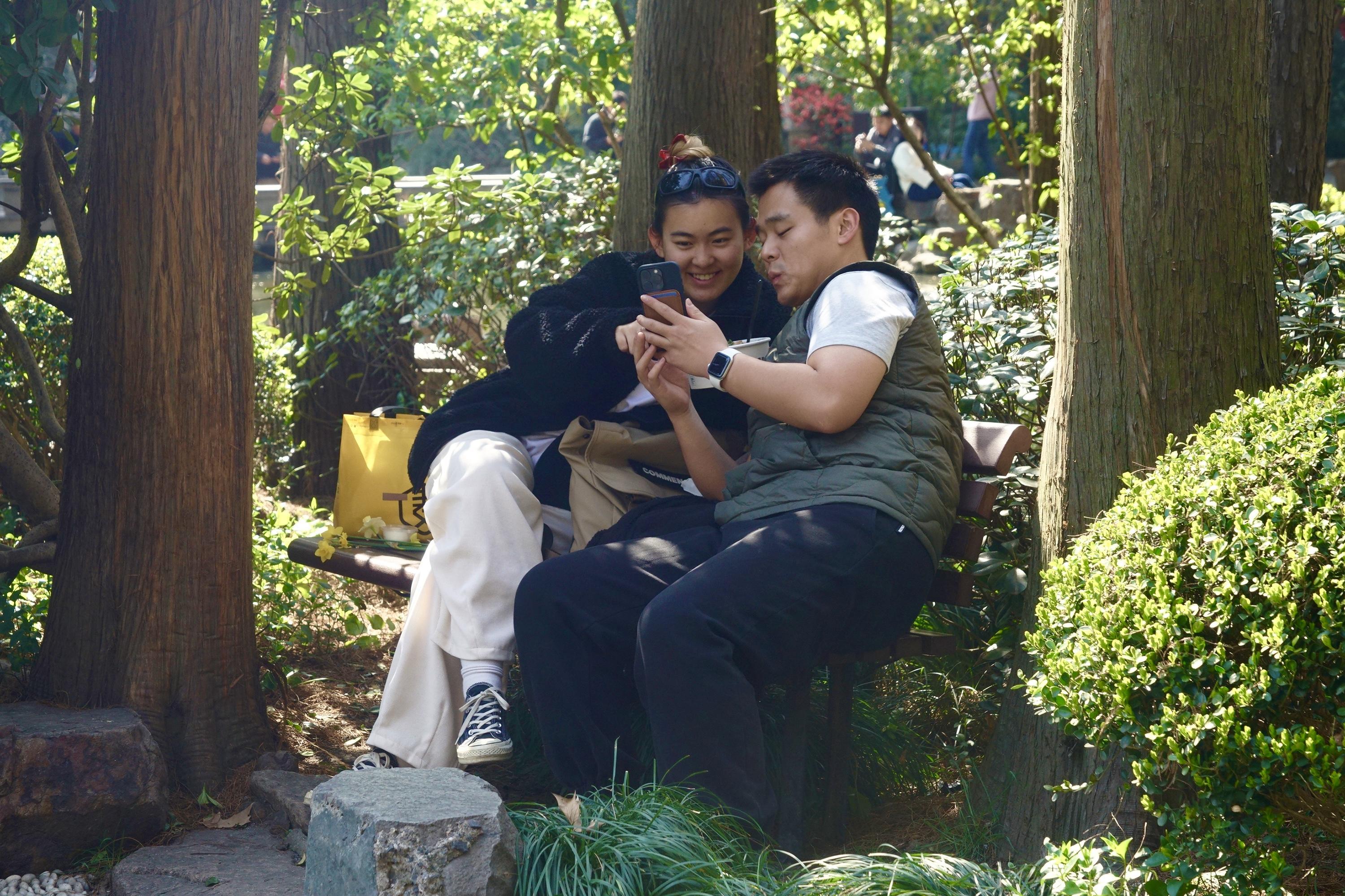 坐在长椅上的年轻人分享着短视频,手舞足蹈地比划着,哈哈笑出声来。除了老年人,人民公园也是小年轻们聚会的乐园。