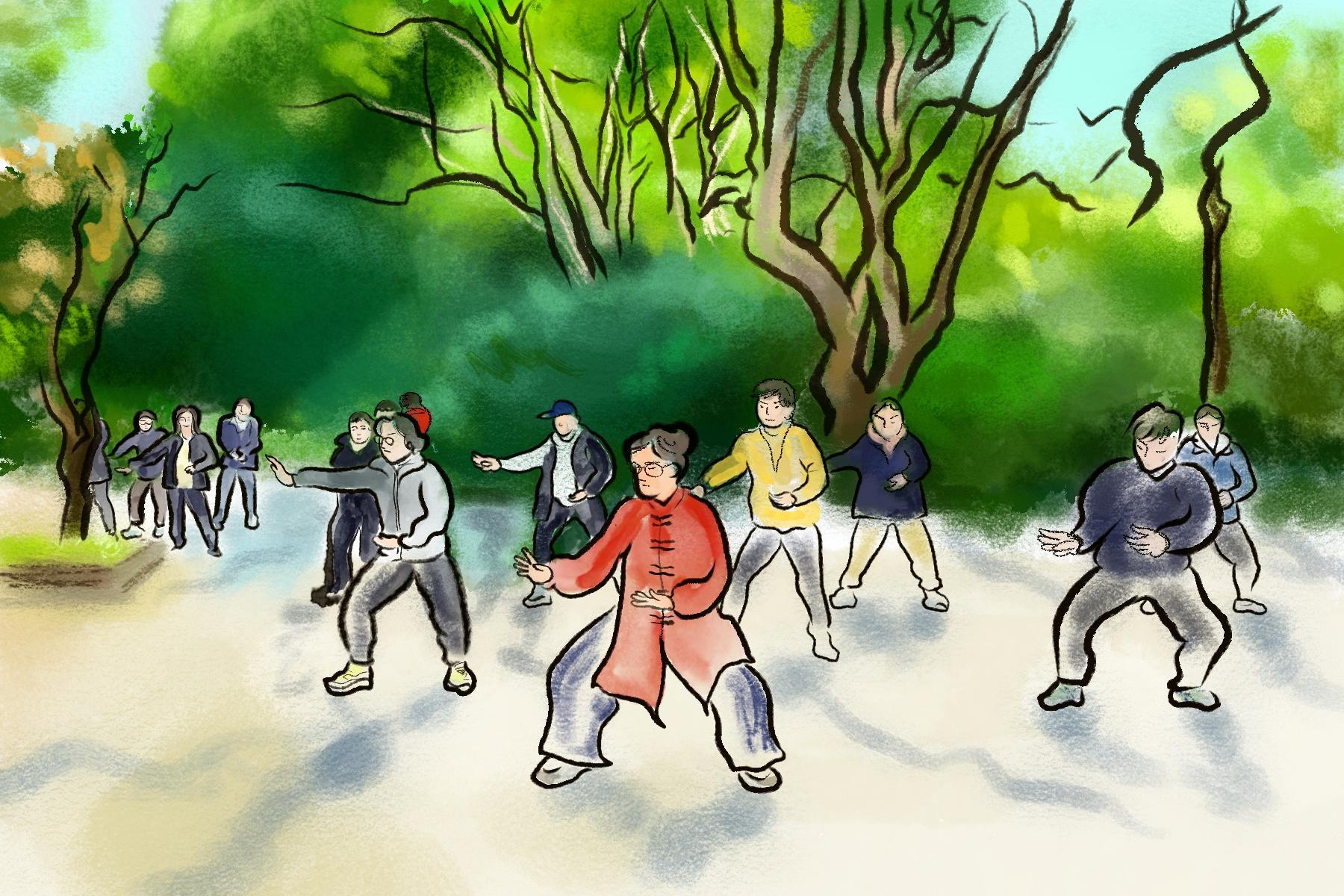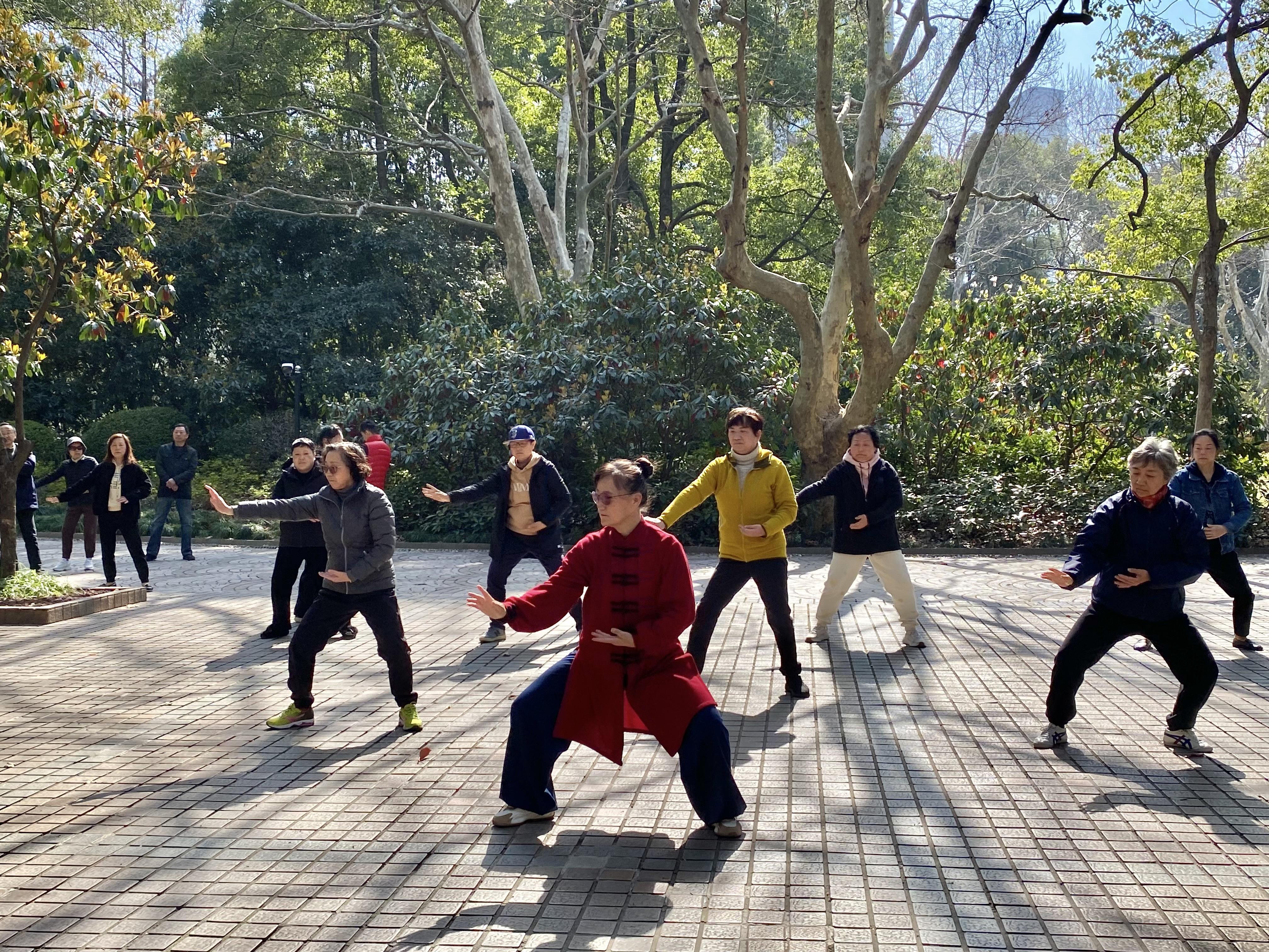 强身健体是市民们一直以来的优良传统。公园空地上,一群精神抖擞的老年人正跟着老师认真地打太极。