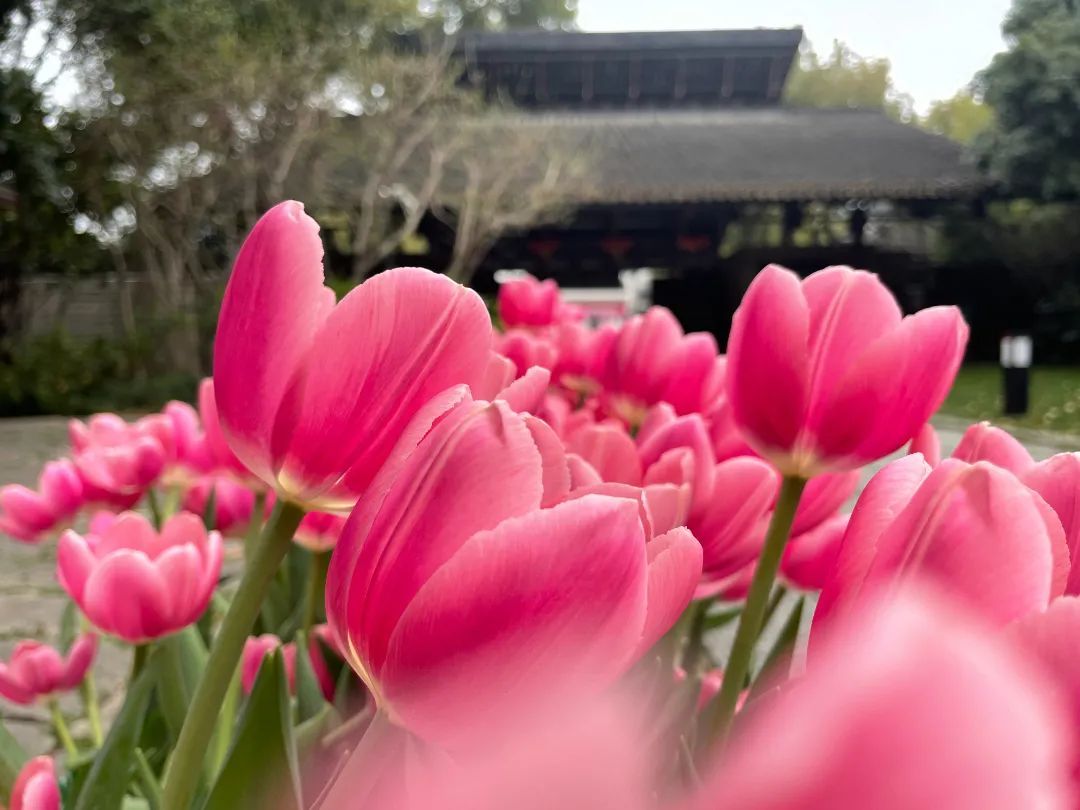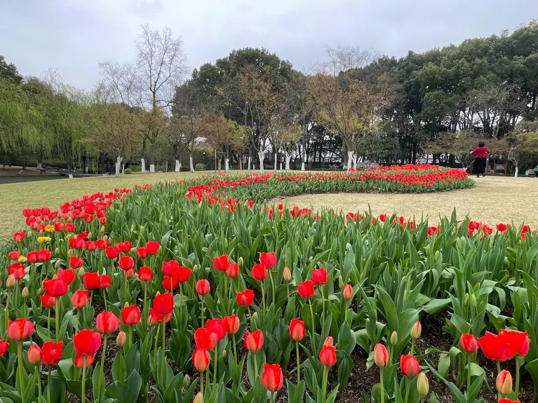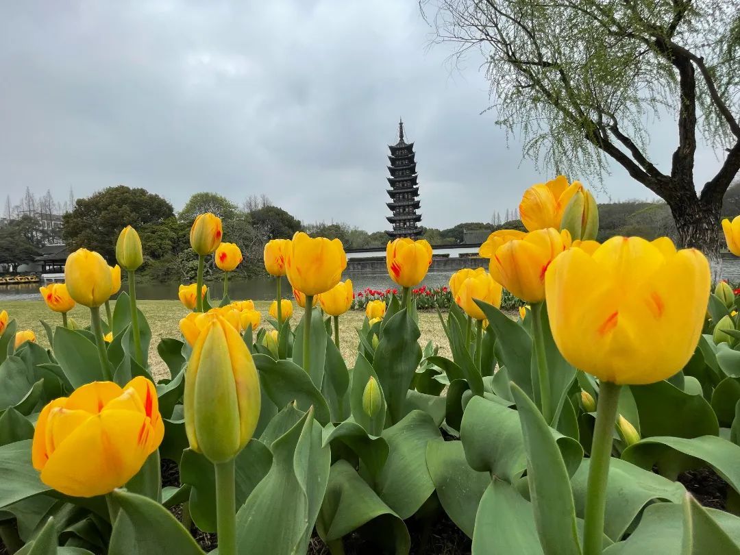 这次是方塔园首次举办较大规模的郁金香花展,共播种了约4万株、约500㎡的郁金香,包含了宝石之光、红色骄傲、孟菲斯、鲑鱼、阿古斯、布利特、昆仑、闪金等19个品种。