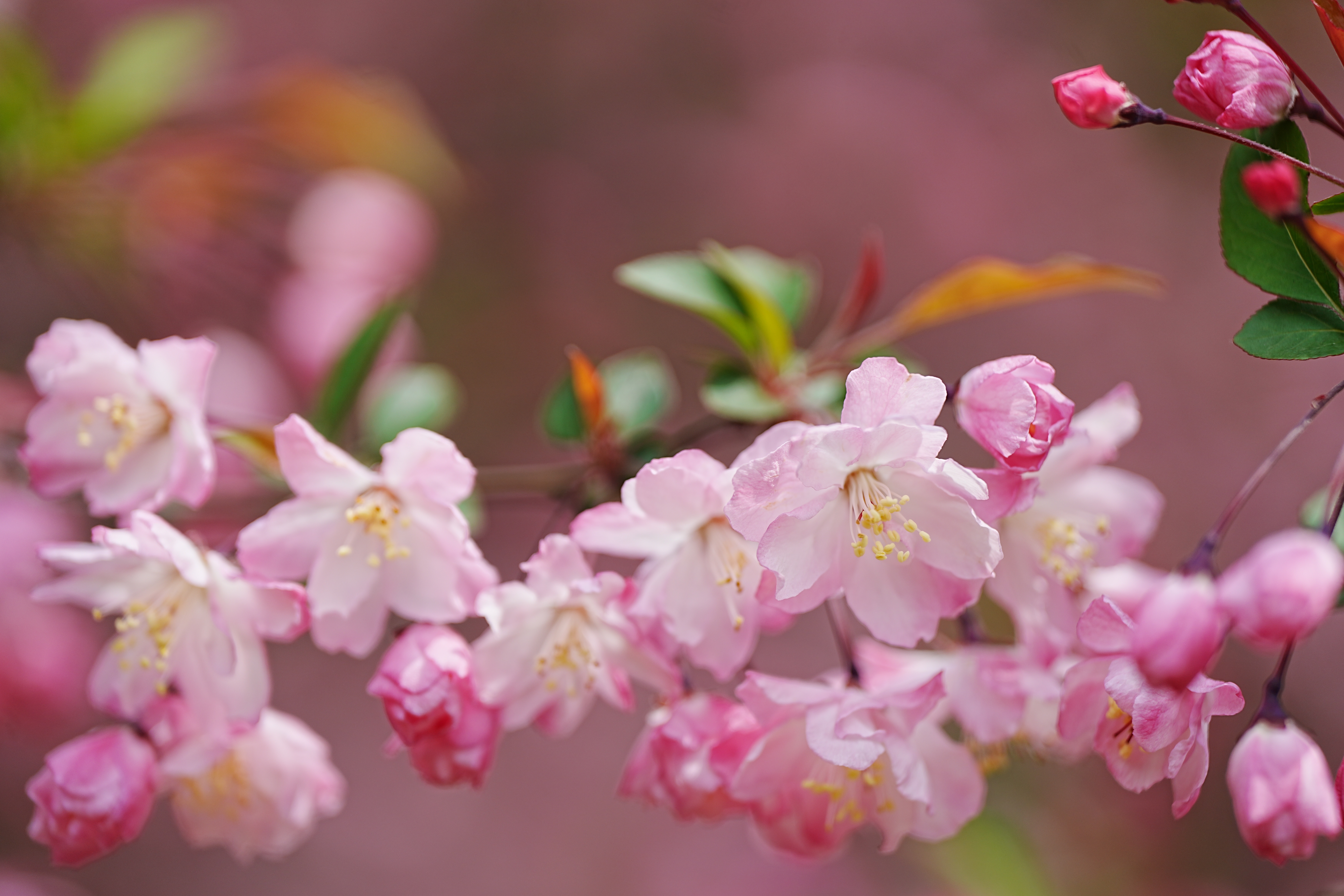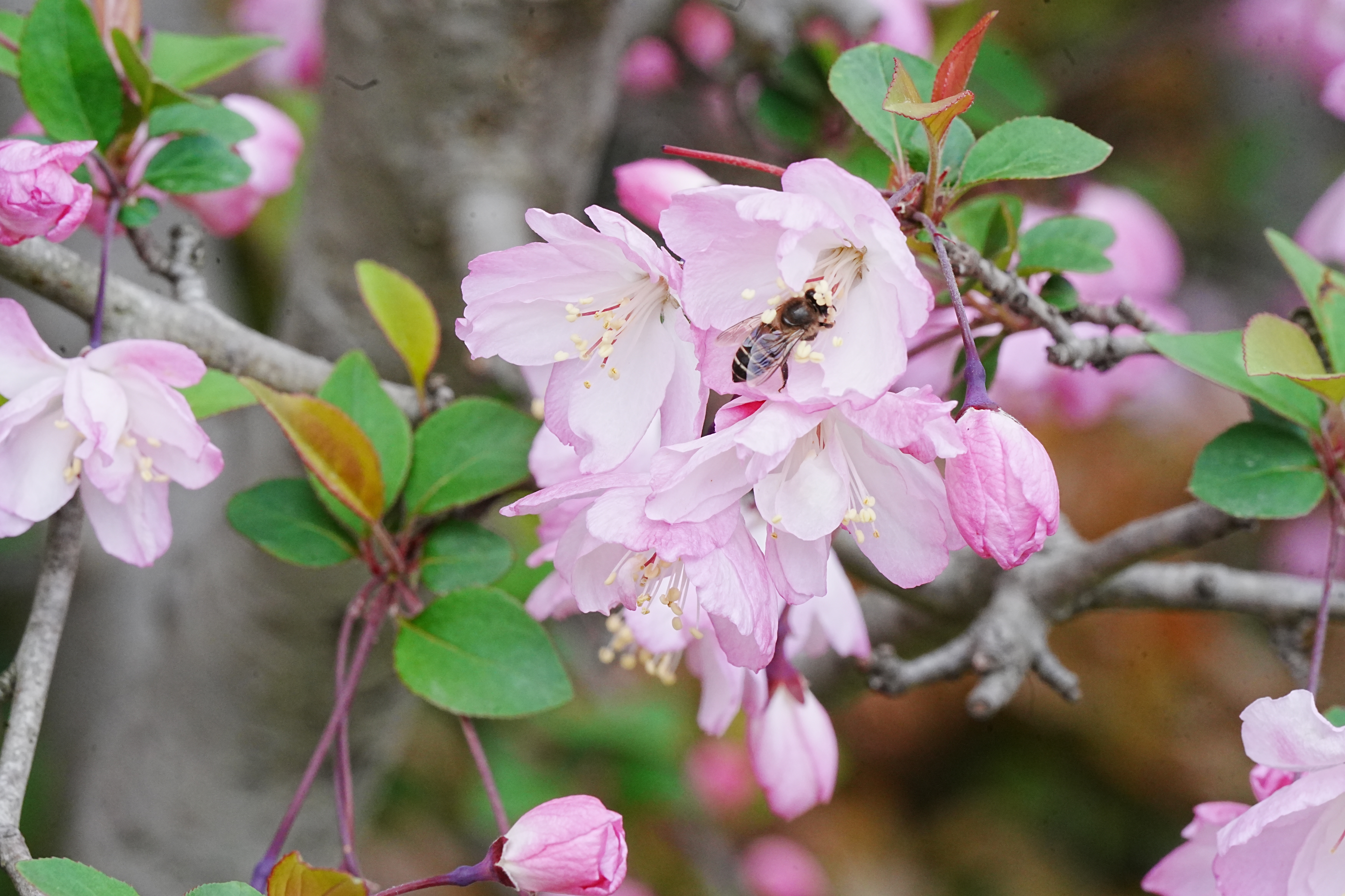中国人爱海棠,不仅因其花姿绰约,花开似锦,还缘于海棠吉祥美好的寓意。海棠隶属蔷薇科,以其花朵嫣红粉白交织相间、楚楚动人而誉为“国艳”。在盛放的花海中,只只蜜蜂们也耐不住这成片的春意扰动,煽动着翅膀穿梭在花蕊间,勤劳地采摘着春天最新鲜的花蜜。