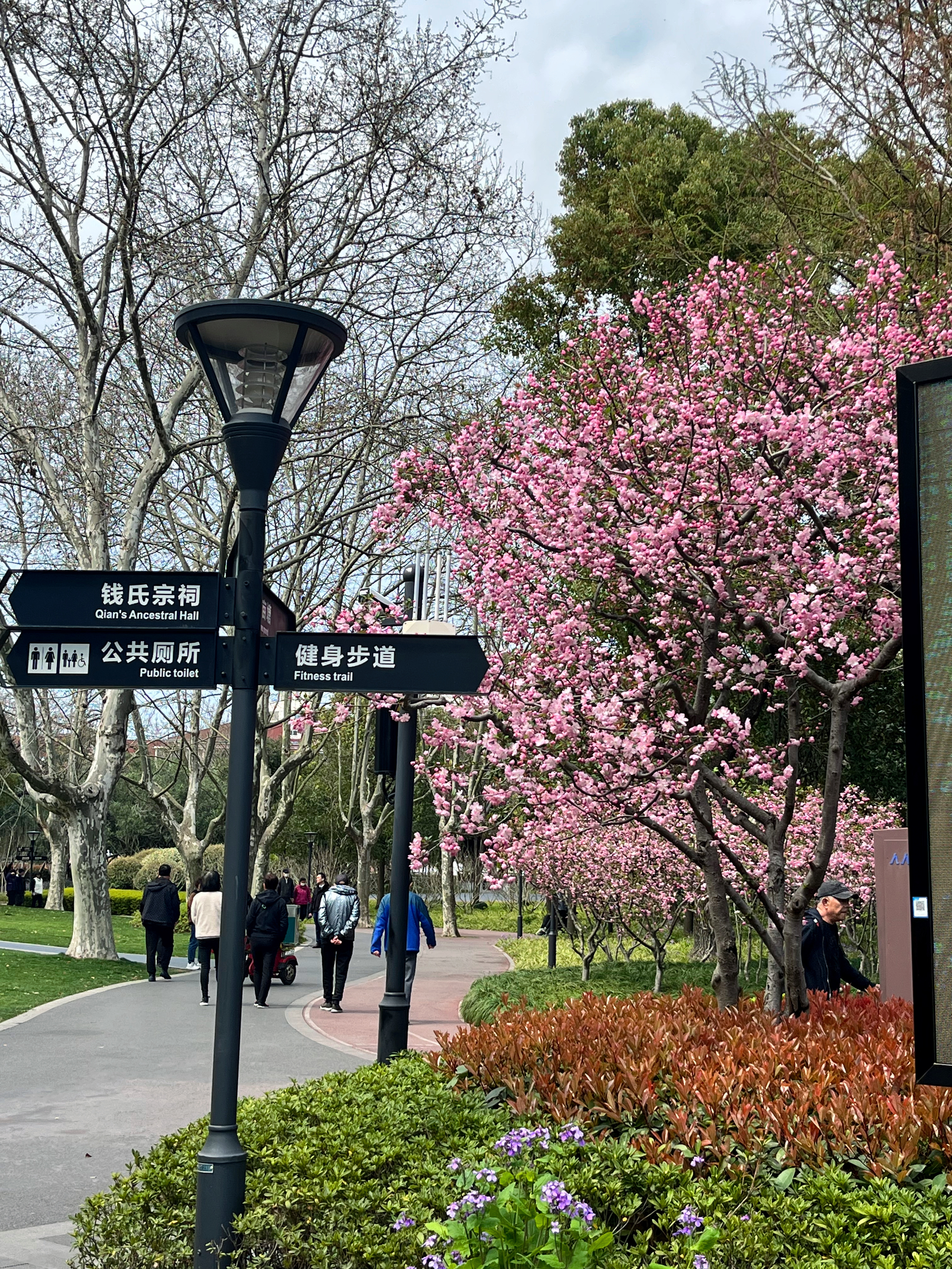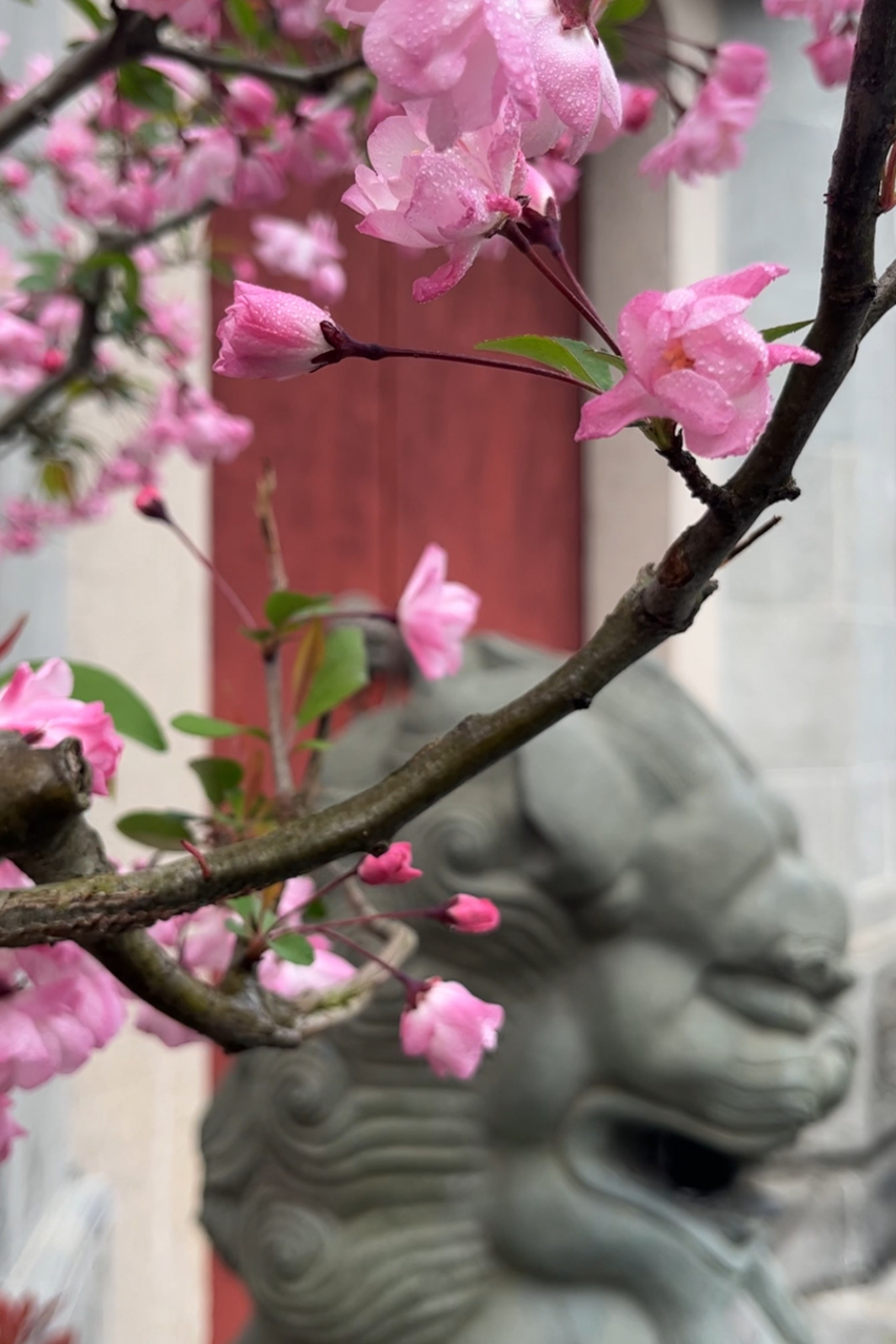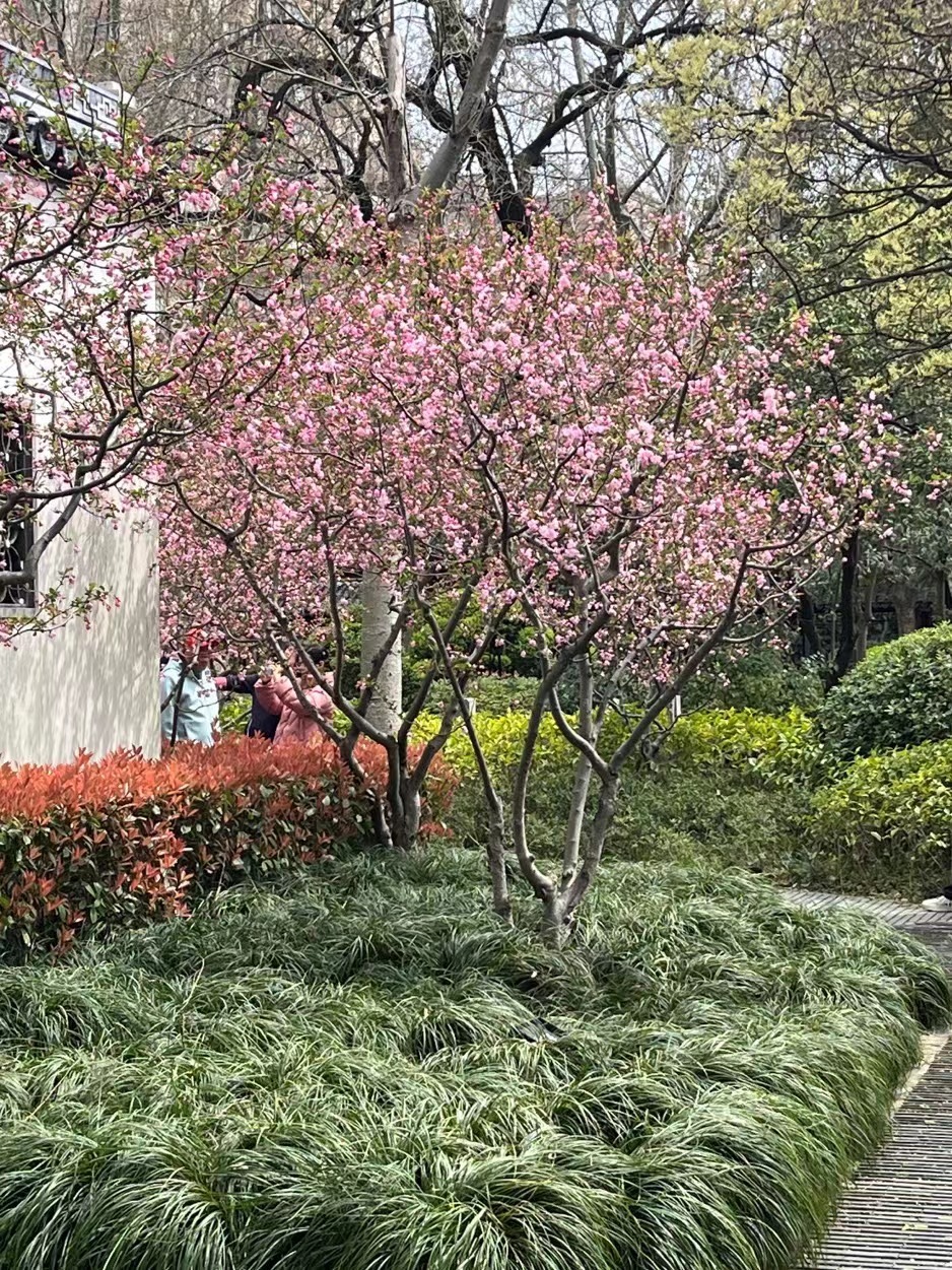 共和新路1555号的闸北公园内,近百棵垂丝海棠已经迎来花期,绽放于公园各处。公园内的钱氏宗祠门前,盛开的垂丝海棠古韵盎然,精美的砖雕、镂空花窗、砖红的木门、门前的石狮……古建筑赋予海棠花属于中式传统美学的惊艳,是上海中心城区难得的“海棠入画江南”拍摄点位。