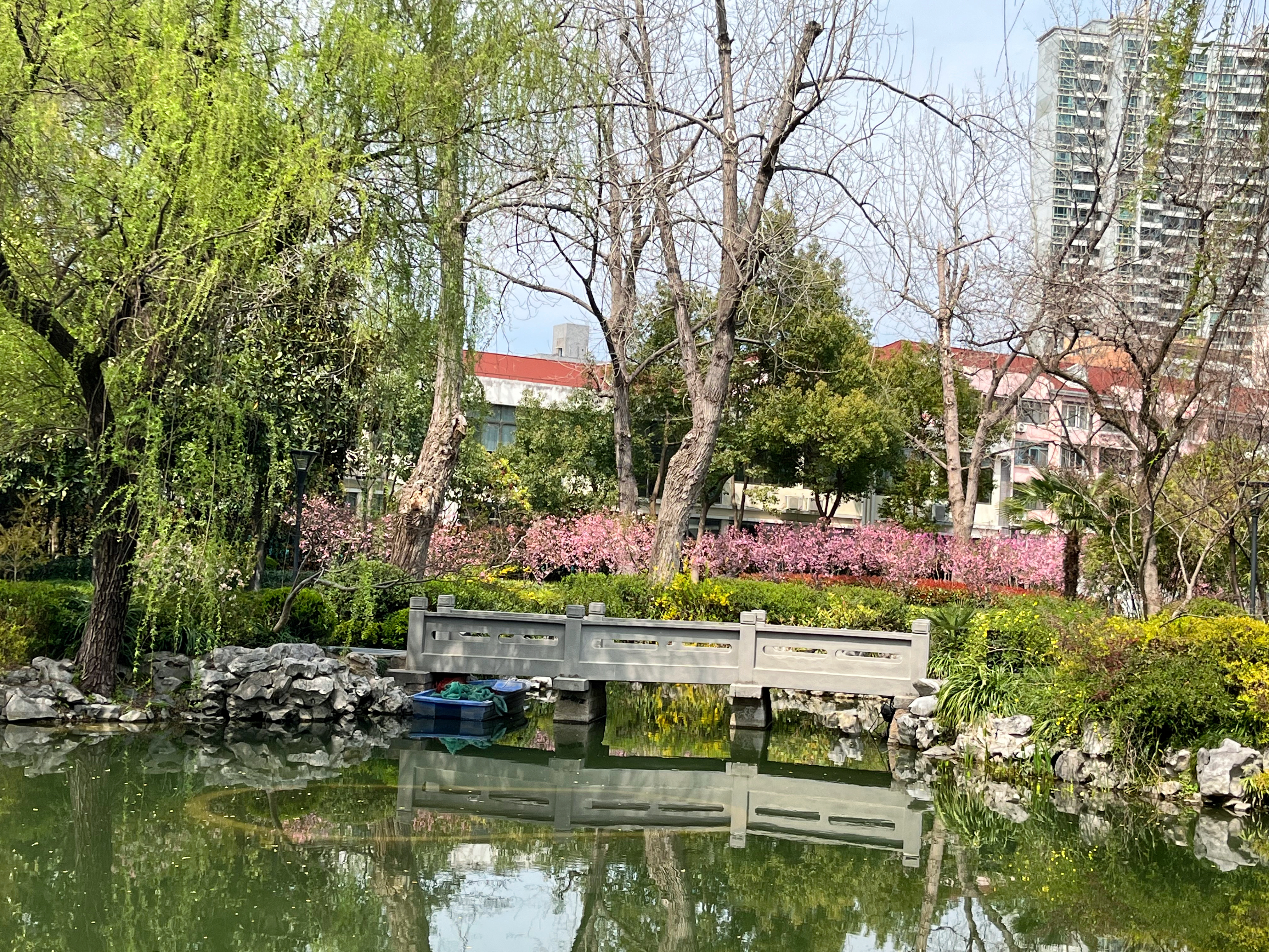 除了钱氏宗祠,闸北公园内的小桥、流水、凉亭亦是韵味十足,晴好时海棠花娇柔红艳,花开似锦,婀娜多姿,阴雨时更显清冷,仿佛一幅幅江南园林的古典画卷走入了现实。