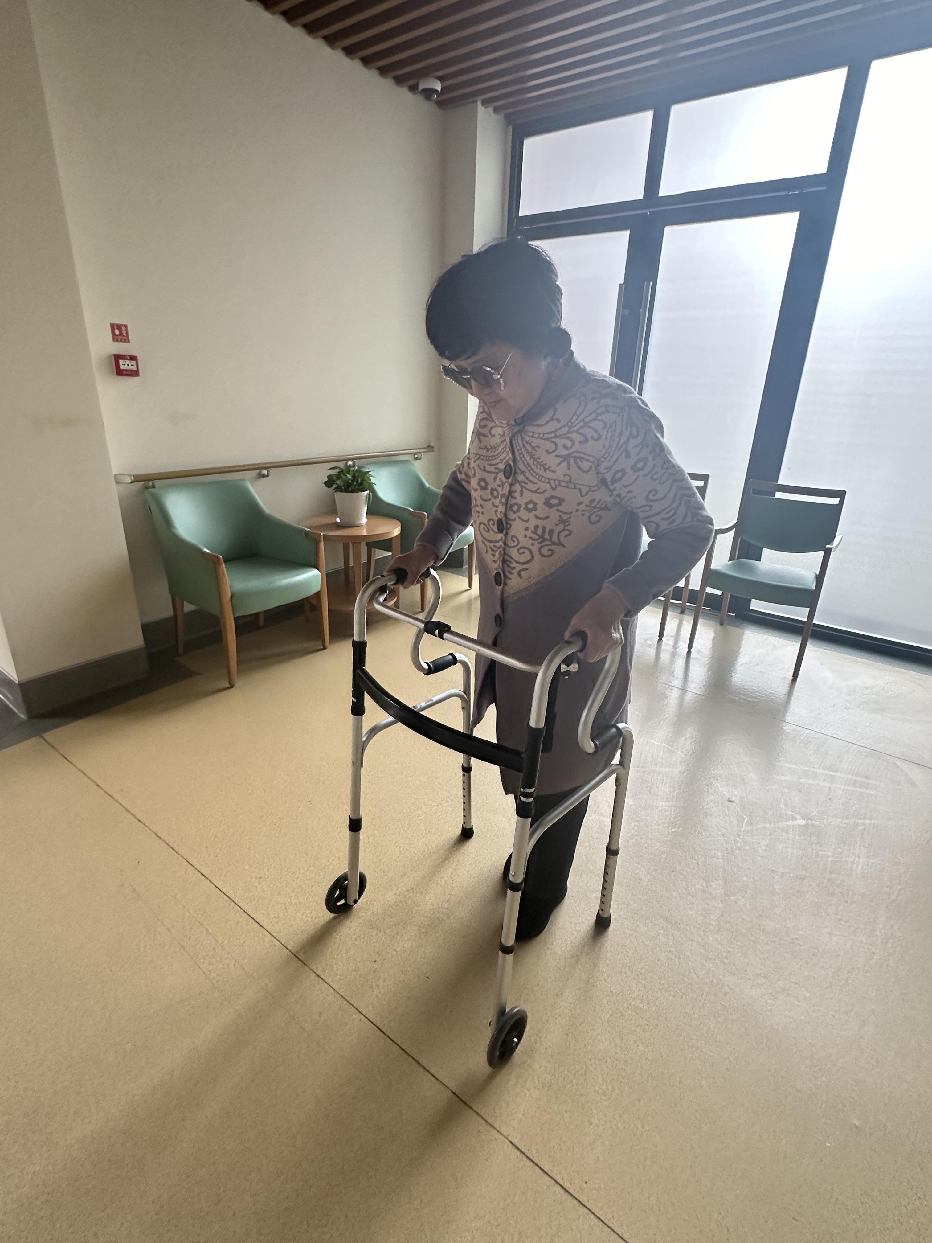 盛阿婆思想的转变,缘于养护院悉心的照顾。由于盛阿婆骨折情况比较严重,肩膀和腿部一直乌青红肿,养护院为盛阿婆制定了个性化的护理步骤,每天逐步开展穴位推拿、助行器行走,通过近半年持续不断的康复理疗,如今的盛阿婆终于能自己“站”起来并行走了。