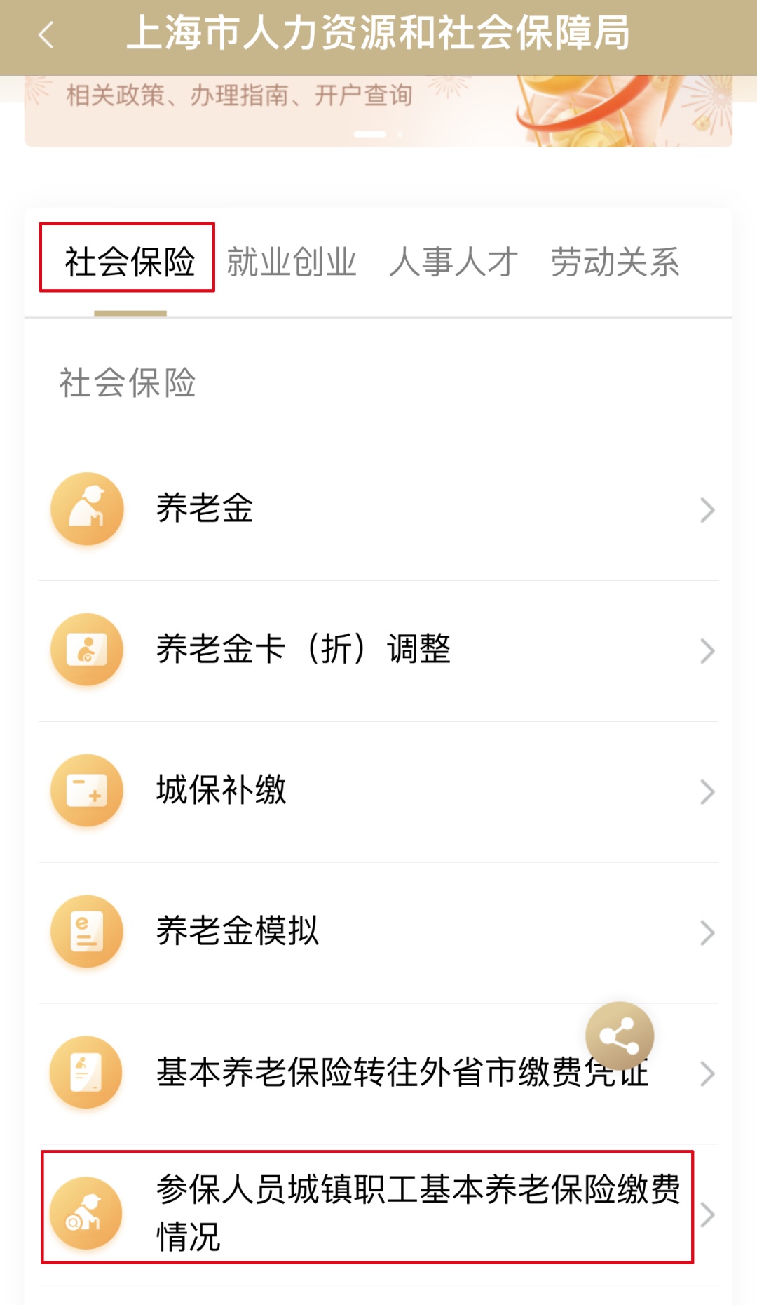 第三步:在“社会保险”栏目找到“参保人员城镇职工基本养老保险缴费情况”并点击进入;
