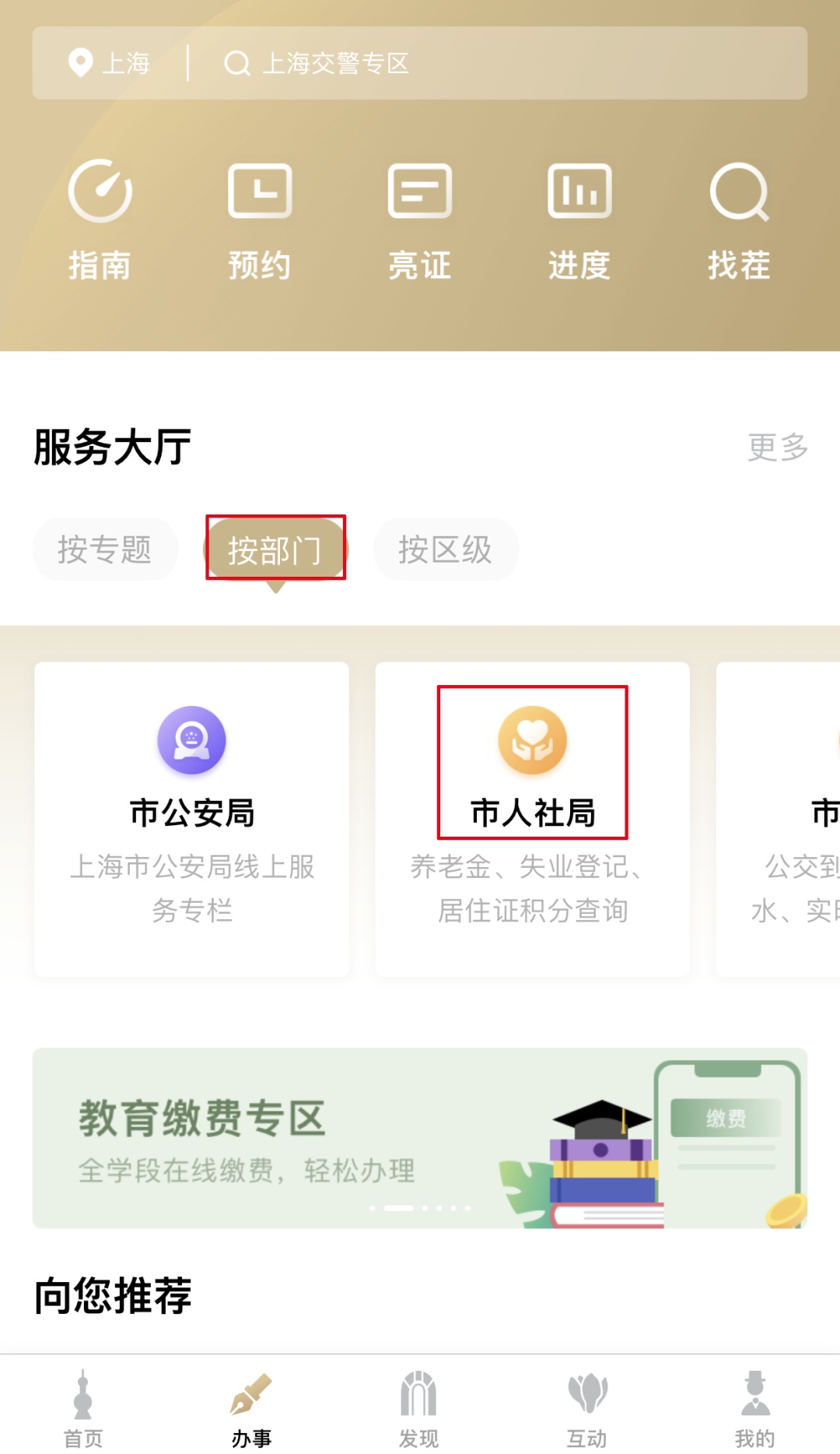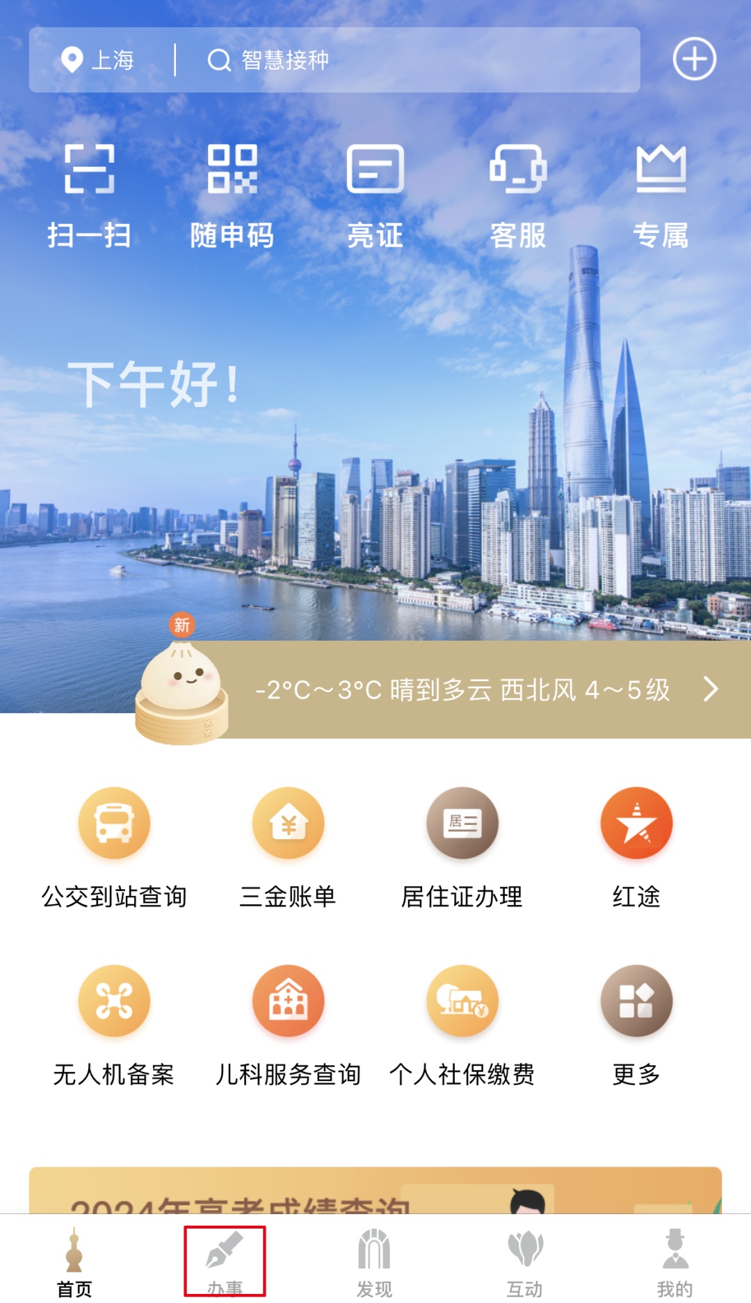 第一步:登录“随申办市民云”APP-点击屏幕下方“办事”;