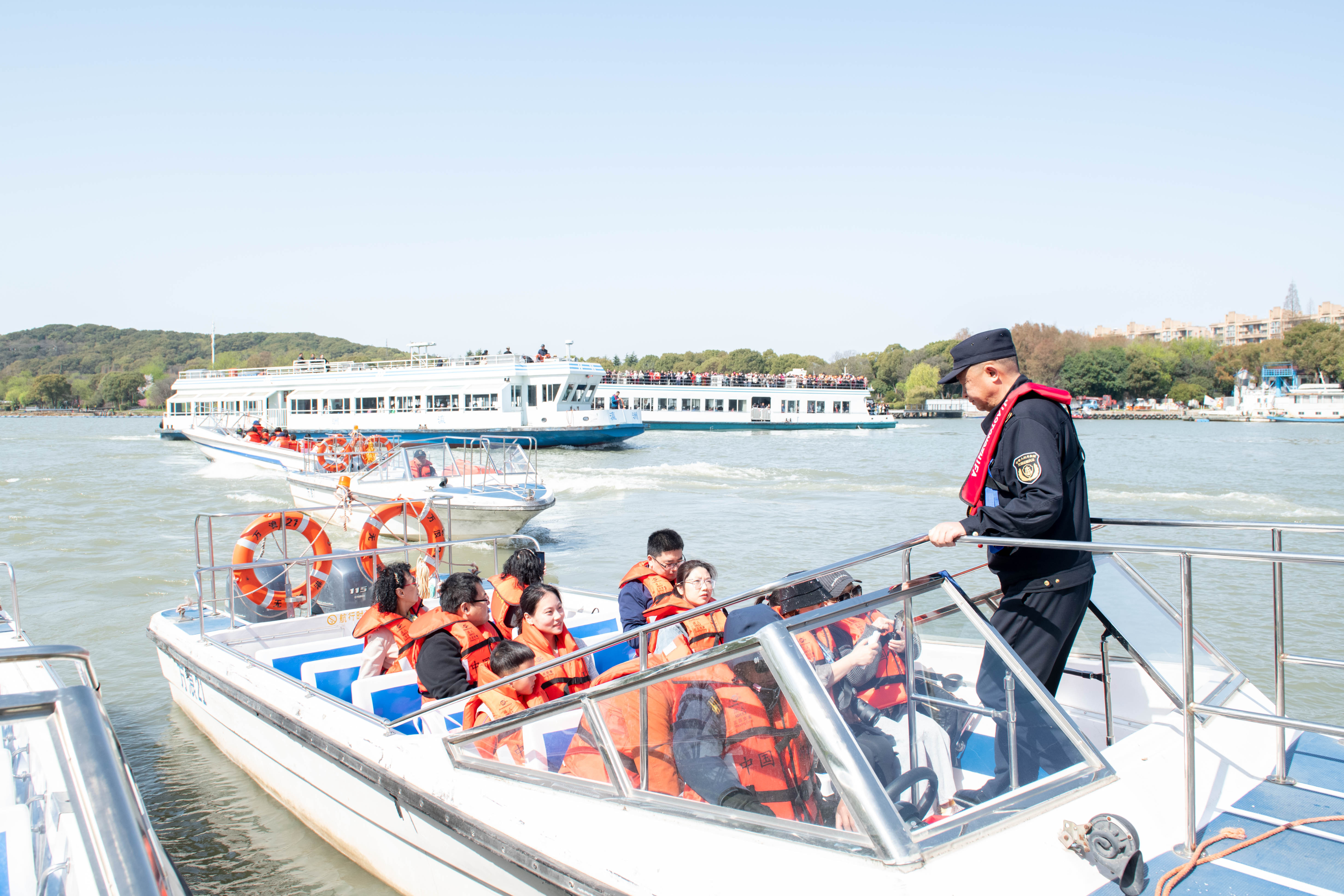 其中,“太湖飞翔2号”“太湖明珠”“瀛洲号”客船、“万浪6”“万浪22”等多艘快艇是当之无愧的“运力担当”。“目前,这些船舶已完成消防、救生、航行、信号、无线电设备等安全检查,游客可以安心开启水上漫游之旅。”执法人员说。
