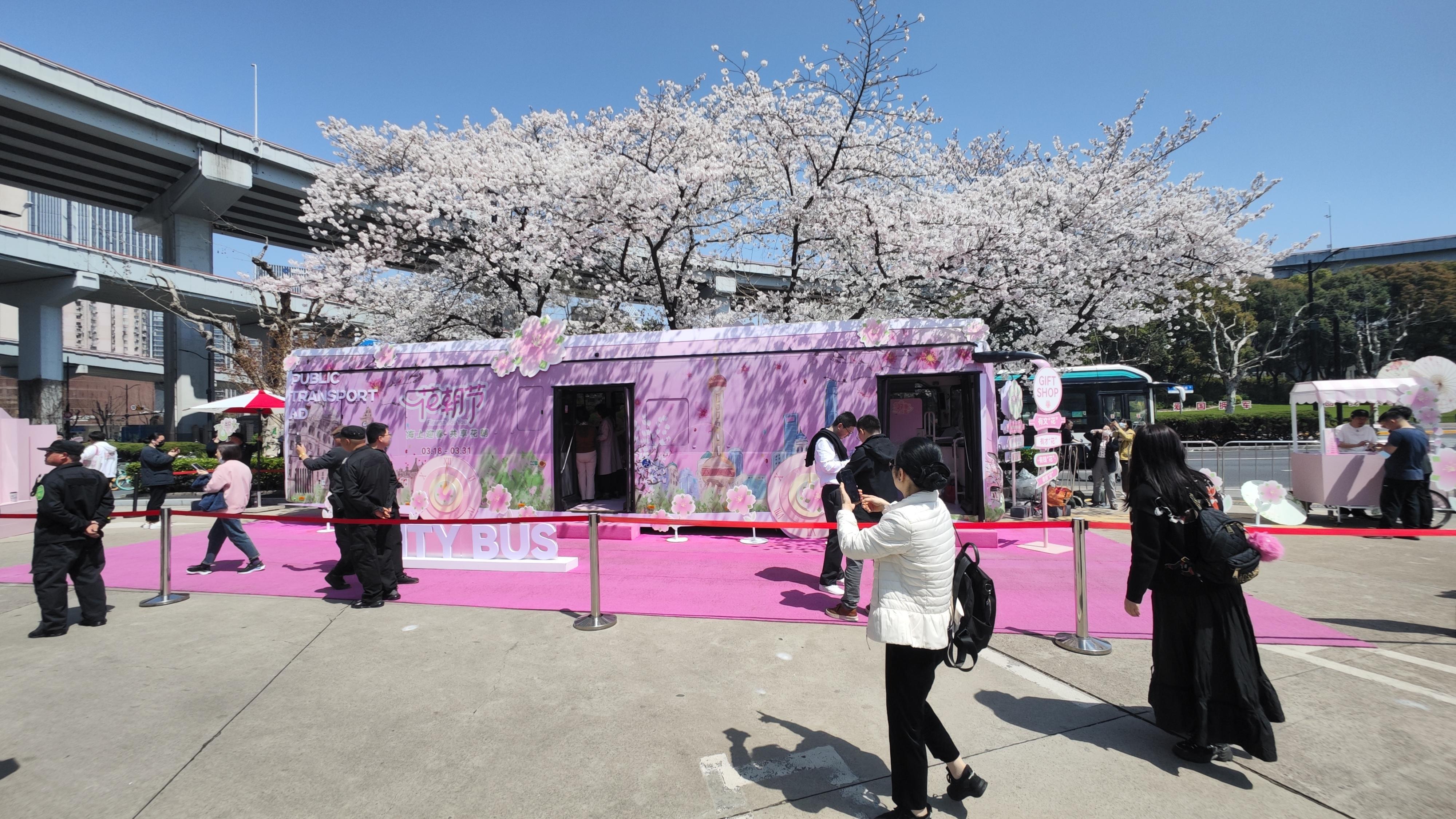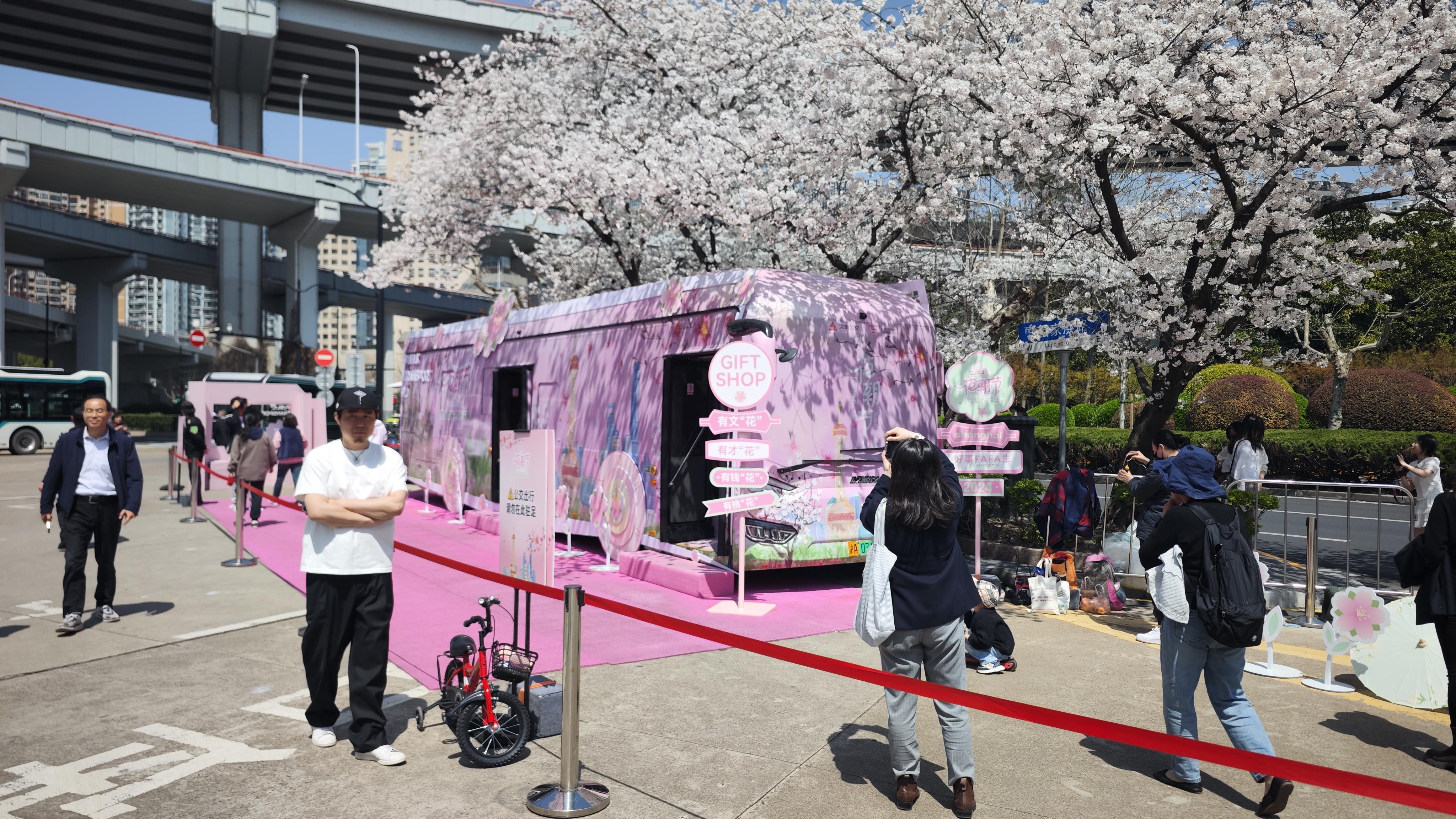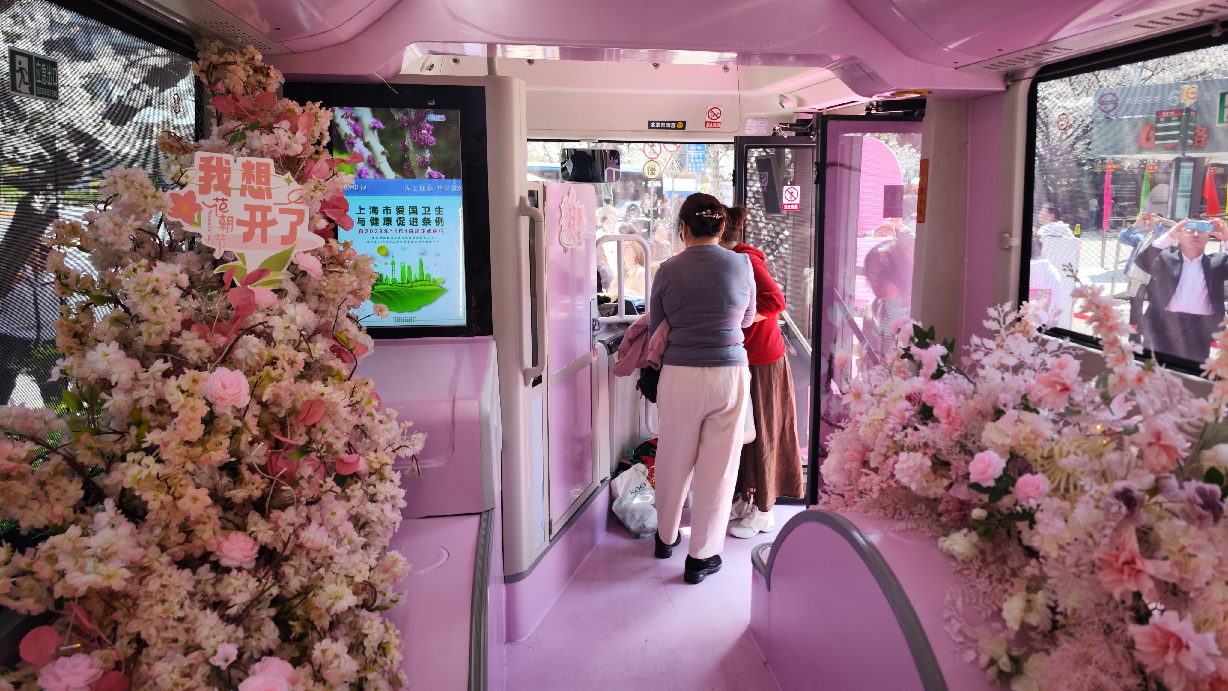 为了让市民们能够尽兴赏花、尽兴拍照,巴士二公司联合上海公共交通广告有限公司和支付宝公司,打造了一辆粉嫩粉嫩的花朝节专列,远远看去,顶上是大片的淡粉色樱花林,中间层是粉色花车,最底下还铺满粉色地毯,走进车厢内也同样精彩,全部“种”满了粉色花卉,白玉兰、牡丹、桃花、栀子花、杜鹃等不下二十多个品种,美不胜收。现场还提供团扇、油纸伞等拍照道具,氛围感拉满。市民们围绕着樱花树和花车,怎么拍都好看,怎么拍仿佛也拍不够。“我觉得很浪漫,一直在等花开,今天我先生说开了,赶紧过来拍。今年因为有这辆花车,更好看了,最美公交车站,名不虚传。”