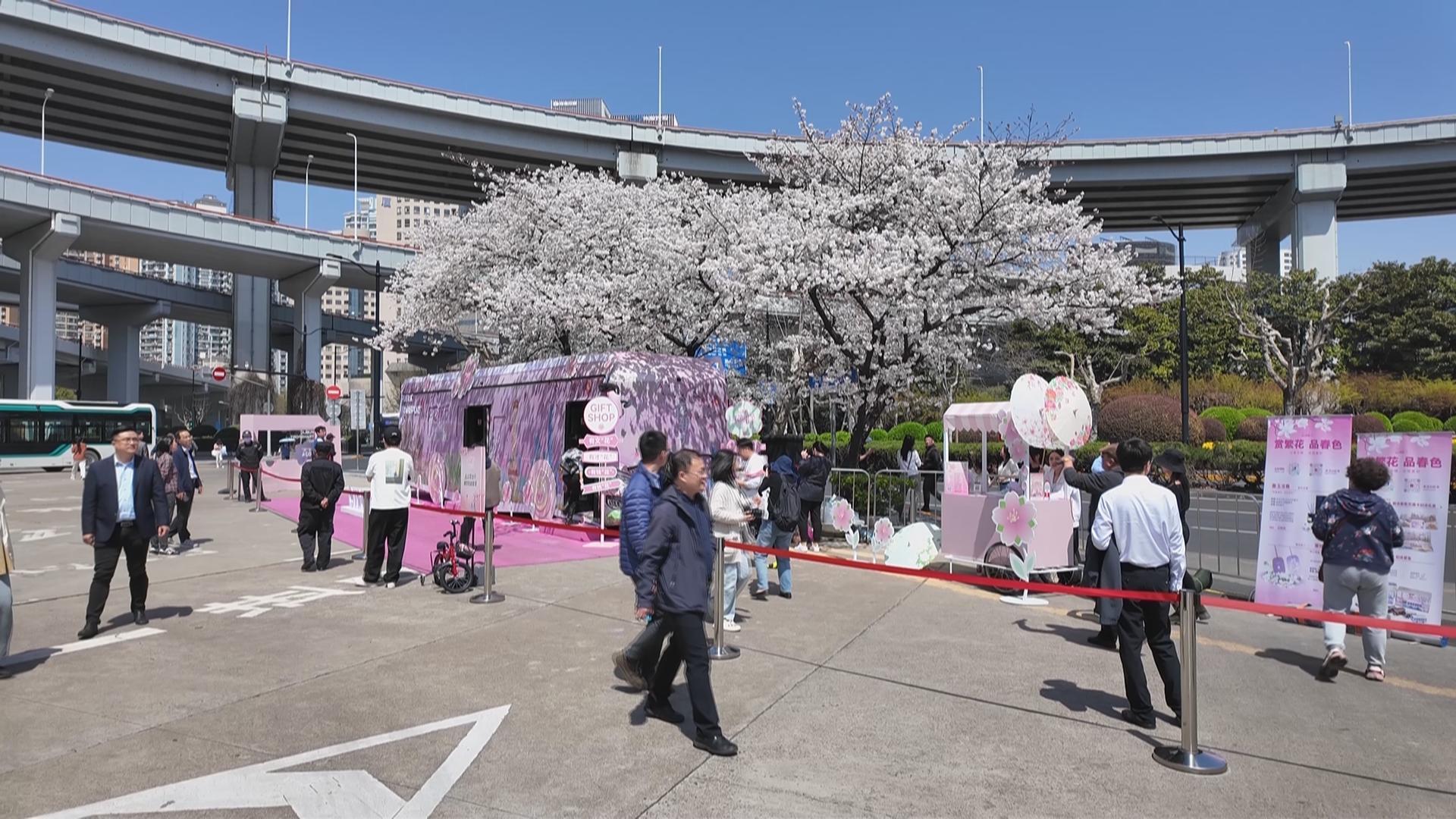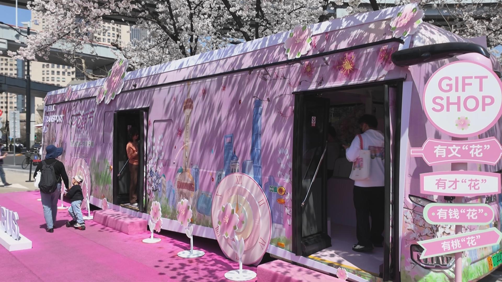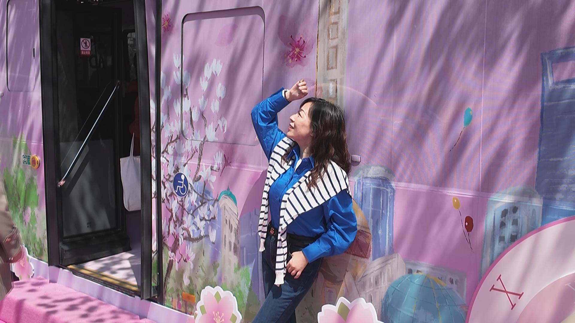 为了让市民们能够尽兴赏花、尽兴拍照,巴士二公司联合上海公共交通广告有限公司和支付宝公司,打造了一辆粉嫩粉嫩的花朝节专列,远远看去,顶上是大片的淡粉色樱花林,中间层是粉色花车,最底下还铺满粉色地毯,走进车厢内也同样精彩,全部“种”满了粉色花卉,白玉兰、牡丹、桃花、栀子花、杜鹃等不下二十多个品种,美不胜收。现场还提供团扇、油纸伞等拍照道具,氛围感拉满。市民们围绕着樱花树和花车,怎么拍都好看,怎么拍仿佛也拍不够。“我觉得很浪漫,一直在等花开,今天我先生说开了,赶紧过来拍。今年因为有这辆花车,更好看了,最美公交车站,名不虚传。”